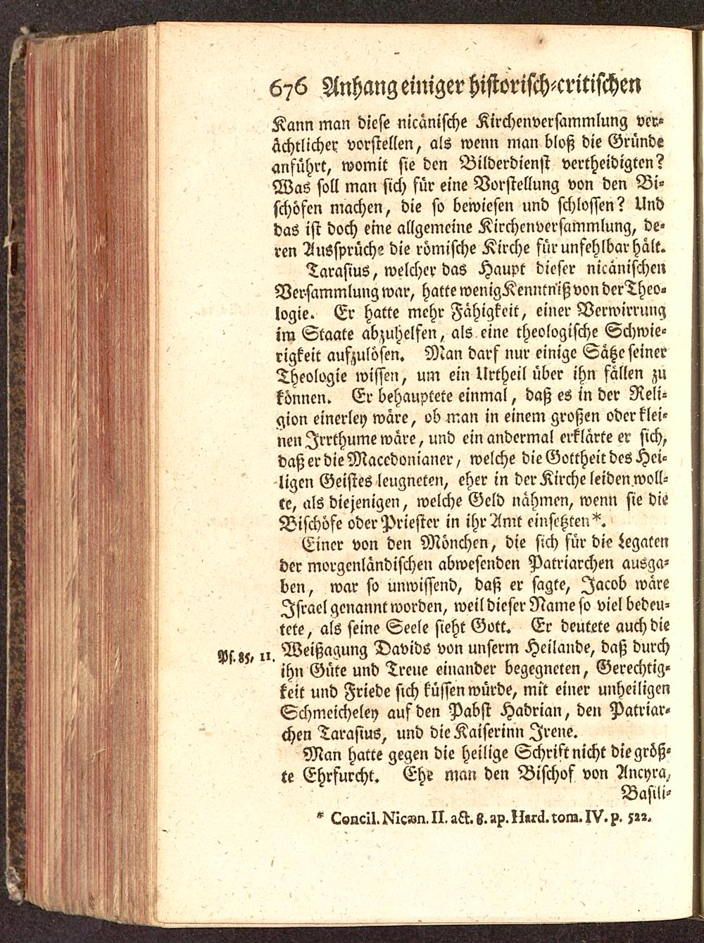 Einer von den Mönchen, die sich für die Legatender morgenländischen abwesenden Patriarchen ausga-ben, war so unwissend, daß er sagte, Jacob wäreIsrael genannt worden, weil dieser Name so viel bedeu-tete, als seine Seele sieht Gott . Er deutete auch dieVs.»5, ». Weißagung Davids von unserm Heilande, daß durchihn Güte und Treue einander begegneten, Gerechtig-keit und Friede sich küssen würde, mit einer unheiligenSchmeicheley auf den Pabst Hadrian, den Patriar-chen Tarasius , und die Kaiserinn Irene.