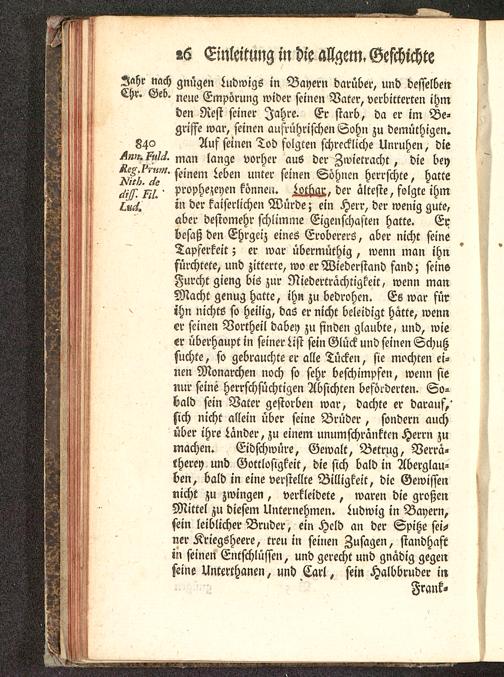 ^M. /«/^. man lange vorher aus der Zwietracht, die bey5^//^s" seinem Leben unter seinen Söhnen herrschte, hatte-M^/' Propheten können. Lothar. , der älteste , folgte ihm' in der kaiserlichen Würde; ein Herr, der wenig gute,aber destomehr schlimme Eigenschaften hatte. Erbesaß den Ehrgeiz eines Eroberers, aber nicht seineTapferkeit; er war übermüthig, wenn man ihnfürchtete, und zitterte, wo er Wiederstand fand; seine-Furcht gieng bis zur Niederträchtigkeit, wenn manMacht genug hatte, ihn zu bedrohen. Es war fürihn nichts so heilig, das er nicht beleidigt hätte, wenner seinen Vortheil dabey zu finden glaubte, und, wieer überhaupt in seiner List sein Glück und seinen Schußsuchte, so gebrauchte er alle Tücken, sie mochten ei-nen Monarchen noch so sehr beschimpfen, wenn sienur seine herrschsüchtigen Absichten beförderten. So-bald sein Vater gestorben war, dachte er darauf,'sich nicht allein über seine Brüder, sondern auchüber ihre Länder, zu einem unumschränkten Herrn zumachen. Eidschwüre, Gewalt, Betrug, Verrä-therey und Gottlosigkeit, die sich bald in Aberglau-ben, bald in eine verstellte Billigkeit, die Gewissennicht zu zwingen, verkleidete, waren die großenMittel zu diesem Unternehmen. Ludwig in Bayern,sein leiblicher Bruder, ein Held an der Spitze sei-ner Kriegsheere, treu in seinen Zusagen, standhaftin seinen Entschlüssen, und gerecht und gnädig gegenseine Unterthanen, und Carl, sein Halbbruder in