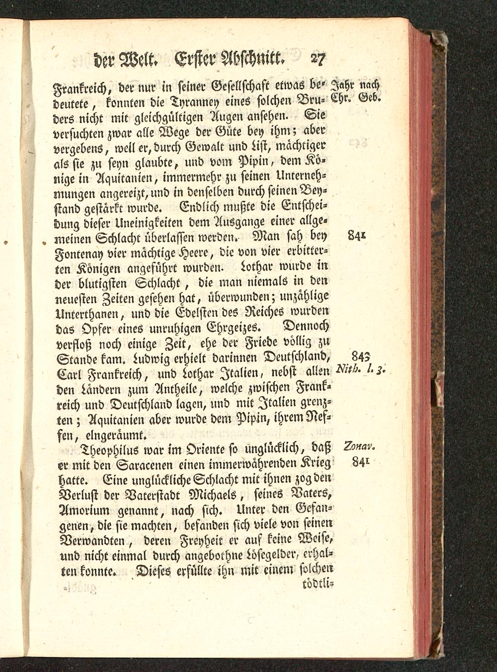Frankreich , der nur in seiner Gesellschaft etwas be« Zahr nachdeutete, konnten die Tyrannei) eines solchen Bru- Chr. Geb.ders nicht mit gleichgültigen Augen ansehen. Sieversuchten zwar alle Wege der Güte bey ihm; abervergebens, weil er, durch Gewalt und List, mächtigerals sie zu seyn glaubte, und vom Pipin, dem Kö-nige in Aquitanien , immermehr zu seinen Unterneh-mungen angereizt, und in denselben durch seinen Bey-stand gestärkt wurde. Endlich mußte die Entschei-dung dieser Uneinigkeiten dem Ausgange einer allge-» meinen Schlacht überlasten werden. Man sah bey 841Fontenay vier mächtige Heere, die von vier erbitter-ten Königen angeführt wurden. Lothar wurde mder blutigsten Schlacht, die man niemals in denneuesten Zeiten gesehen hat, überwunden; unzähligeUnterthanen, und die Edelsten des Reiches wurdendas Opfer eines unruhigen Ehrgeizes. Dennochverfloß noch einige Zeit, ehe der Friede völlig zuStande kam. Ludwig erhielt darinnen Deutschland , 84?Carl Frankreich, und Lothar Italien, nebst allenden Ländern zum Antheile, welche zwischen Frank-reich und Deutschland lagen, und mit Italien grenz-ten ; Aquitanien aber wurde dem Pipin, ihrem Nef-fen, eingeräumt.