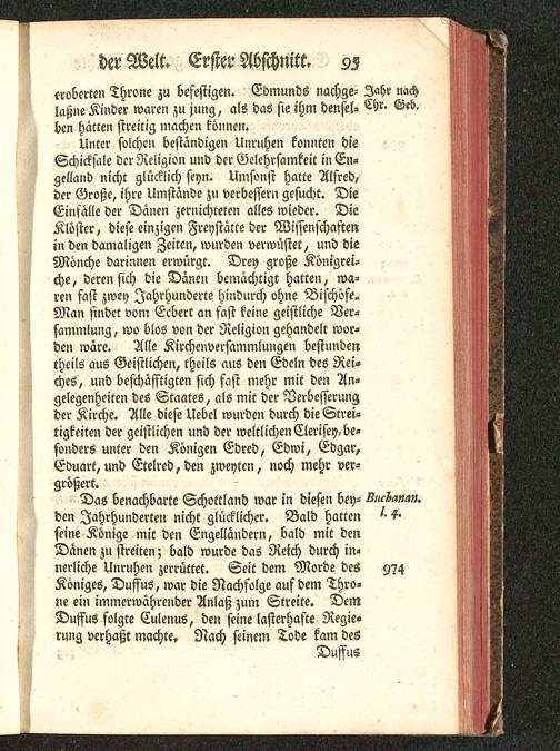 Das benachbarte Schottland war in diesen bey-den Jahrhunderten nicht glücklicher. Bald hatten ^ 5seine Könige mit den Engelländern, bald mit denDänen zu streiten; bald wurde das Reich durch in-nerliche Unruhen zerrüttet. Seit dem Morde des 974Königes, Duffus, war die Nachfolge auf dem Thro-ne ein immerwährender Anlaß zum Streite. DemDuffus folgte Culenus, den seine lasterhafte Regie-rung verhaßt machte. Nach seinem Tode kam des