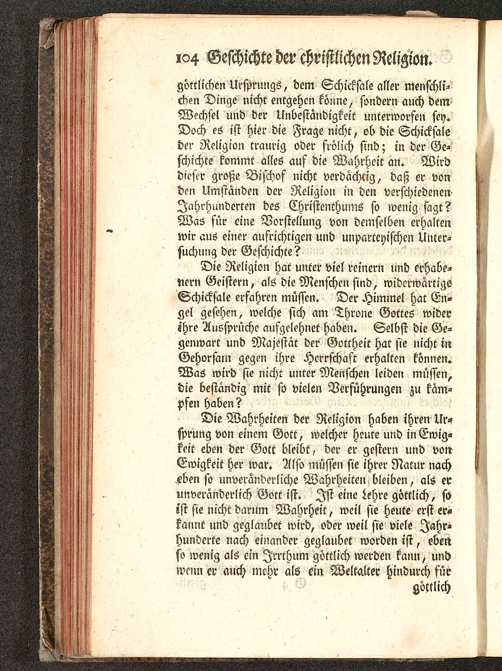 göttlichen Ursprungs, dem Schicksale aller menschli-chen Dinge nicht entgehen könne, sondern auch demWechsel und der Unbeständigkeit unterworfen sey.Doch es ist hier die Frage nicht, ob die Schicksaleder Religion traurig oder frölich sind; in der Ge-schichte kommt alles auf die Wahrheit an. Wirddieser große Bischof nicht verdächtig, daß er vonden Umstanden der Religion in den verschiedenen-Jahrhunderten des Christenthums so wenig sagt?Was für eine Vorstellung von demselben erhaltenwir aus einer aufrichtigen und unparteyischen Unter-suchung der Geschichte?
