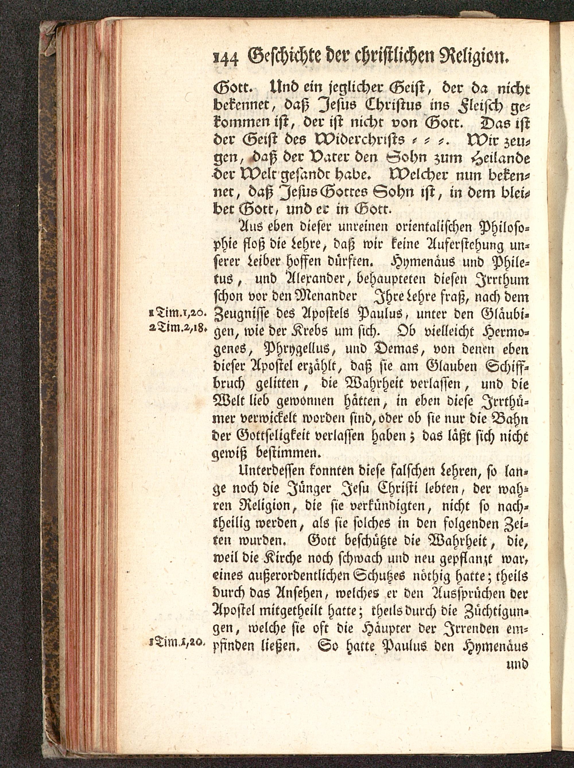 Unterdessen konnten diese falschen Lehren, so lan-ge noch die Jünger Jesu Christi lebten, der wah-ren Religion, die sie verkündigten, nicht so nach-theilig werden, als sie solches in den folgenden Zei-ten wurden. Gott beschützte die Wahrheit, die,weil die Kirche noch schwach und neu gepflanzt war,eines außerordentlichen Schuhes nöthig hatte; theilsdurch das Ansehen, welches er den Aussprüchen verApostel mitgetheilt hatte; theils durch die Züchtigun-gen, welche sie oft die Haupcer der Irrenden em-,Tim,i,2c>. psinden ließen. So hatte Paulus den Hymenaus