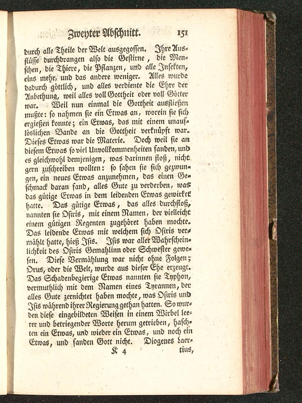 durch alle Theile der Welt ausgegossen. Ihre Aus-flüsse durchdrangen also die Gestirne, die Men-schen, die Thiere, die Pflanzen, und alle Insekten,eins mehr, und das andere weniger. Alles wurdedadurch göttlich, und alles verdiente die Ehre derAnbethunq, weil alles voll Gottheit oder voll Götterwar. Weil nun einmal die Gottheit ausfließenmußte: so nahmen sie ein Etwas an, worein sie sichergießen konnte; ein Etwas, das mit einem unauf-löslichen Bande an die Gottheit verknüpft war.Dieses Etwas war die Materie. Doch weil sie an-diesem Etwas soviel UnVollkommenheiten fanden,undes gleichwohl demjenigen, was darinnen floß, nicht:gern zuschreiben wollten: so sahen sie sich gezwun-gen, ein neues Etwas anzunehmen, das einen Ge-schmack daran fand, alles Gute zu verderben, wasdas gütige Etwas in dem leidenden Etwas gewirkeehatte. Das gütige Etwas, das alles durchfloß,nannten sie Osiris , mit einem Namen, der vielleichteinem gütigen Regenten zugehöret haben mochte.Das leidende Etwas mit welchem sich Osiris ver?mahlt hatte, hieß Isis. Isis war aller Wahrschein,lichkeit des Osiris Gemahlinn oder Schwester gewe-sen. Diese Vermahlung war nicht ohne Folgen 5Orus, oder die Welt, wurde aus dieser Ehe erzeugt»Das Schadenbegierige Etwas nannten sie Typhon,vermuthlich mit dem Namen eines Tyrannen, deralles Gute zernichtet haben mochte, was Osiris undIsis während ihrer Regierung gethan hatten. So wur-den diese eingebildeten Weisen in einem Wirbel lee-rer und bekriegender Worte herum getrieben, hasch-ten ein Etwas, und wieder ein Etwas, und noch einEtwas, und fanden Gott nicht. Diogenes Lacr-