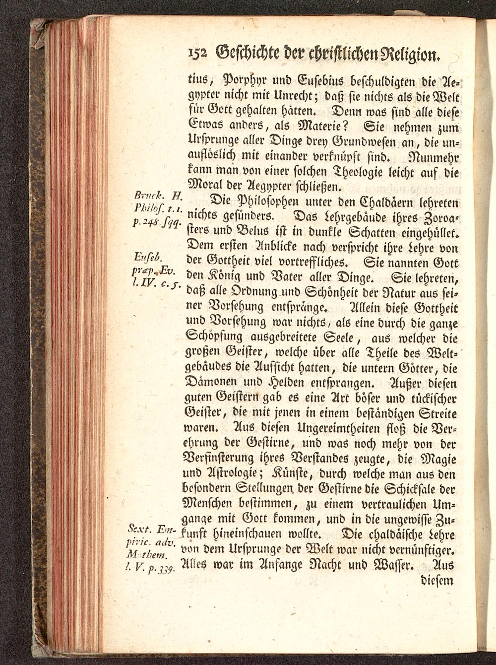 tius, Porphyr und Eusebius beschuldigten die Ae-gypter nicht mit Unrecht; daß sie nichts als die Weltfür Gott gehalten hätten. Dem, was sind alle dieseEtwas anders, als Materie? Sie nehmen zumUrsprünge aller Dinge drey Grundwesen an, die un-auflöslich mit einander verknüpft sind. Nunmehrkann man von einer solchen Theologie leicht auf dieMoral der Aegypter schließen.»7v^ ^' Philosophen unter den Chaldäern lehreten
