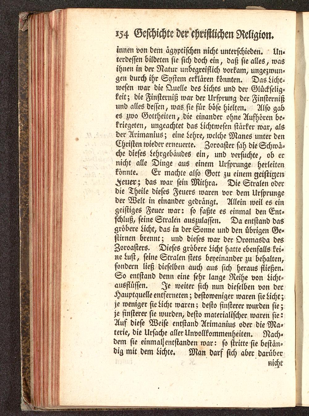 innen von dem ägyptischen nicht unterschieden. Un-terdessen bildeten sie sich doch ein, daß sie alles, wasihnen in der Natur unbegreiflich vorkam, ungezwun-gen durch ihr System erklären könnten. Das Licht-Wesen war die Quelle des Lichts und der Glückselig-keit ; die Finsterniß war der Ursprung der Finsternißund alles dessen, was sie für böse hielten. Also gabes zwo Gottheilen, die einander ohne Aufhören be-kriegeten, ungeachtet das Lichtwesen starker war, alsder Arimanius; eine Lehre, welche Maneö unter denChristen wieder erneuerte. Zoroaster sah die Schwa-che dieses Lehrgebäudes ein, und versuchte, ob ernicht alle Dinge aus einem Ursprünge herleitenkönnte. Er machte also Gott zu einem geistigenHeuer; das war sein Mithra. Die Stralen oderdie Theile dieses Feuers waren vor dem Ursprüngeder Welt in einander gedrängt. Allein weil es eingeistiges Feuer war: so faßte es einmal den Ent-schluß, seine Stralen auszulassen. Da entstand dasgröbere Licht, das in der Sonne und den übrigen Ge-stirnen brennt; und dieses war der Oromasda desZoroasters. Dieses gröbere Licht hatte ebenfalls kei-ne Lust, seine Stralen stets beyeinander zu behalten,sondern ließ dieselben auch aus sich heraus fließen.So entstand denn eine sehr lange Reihe von Licht-ausflüssen. Je weiter sich nun dieselben von derHauptquelle entferneten; destoweniger waren sie Licht;je weniger sie Licht waren; desto finsterer wurden sie;je finsterer sie wurden, desto materialischer waren sie:Auf diese Weise entstand Arimanius oder die Ma-terie, die Ursache aller UnVollkommenheiten. Nach-dem sie einmalj entstanden war: so stritte sie bestän-dig mit dem Lichte. Man darf sich aber darüber