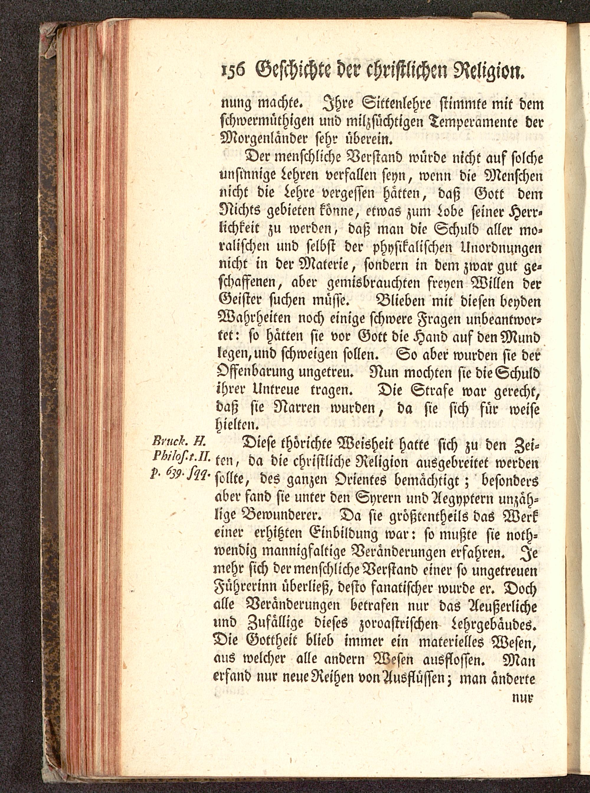 A-tt^. ^. Diese thörichte Weisheit hatte sich zu den Zei-/>/5,7o/, //. , hg h,^ christliche Religion ausgebreitet werden5- H?-/??-sMe, des ganzen Orientes bemächtigt; besondersaber fand sie unter den Syrern und Aegyptern unzäh-lige Bewunderer. Da sie größtentheils das Werkeiner erhitzten Einbildung war: so mußte sie noth-wendig mannigfaltige Veränderungen erfahren. Jemehr sich der menschliche Verstand einer so ungetreuenFührerinn überließ, desto fanatischer wurde er. Dochalle Veränderungen betrafen nur das Aeußerlicheund Zufällige dieses zoroastrischen Lehrgebäudes.Die Gottheit blieb immer ein materielles Wesen,aus welcher alle andern Wesen ausflossen. Manersand nur neue Reihen von Ausflüssen; man änderte