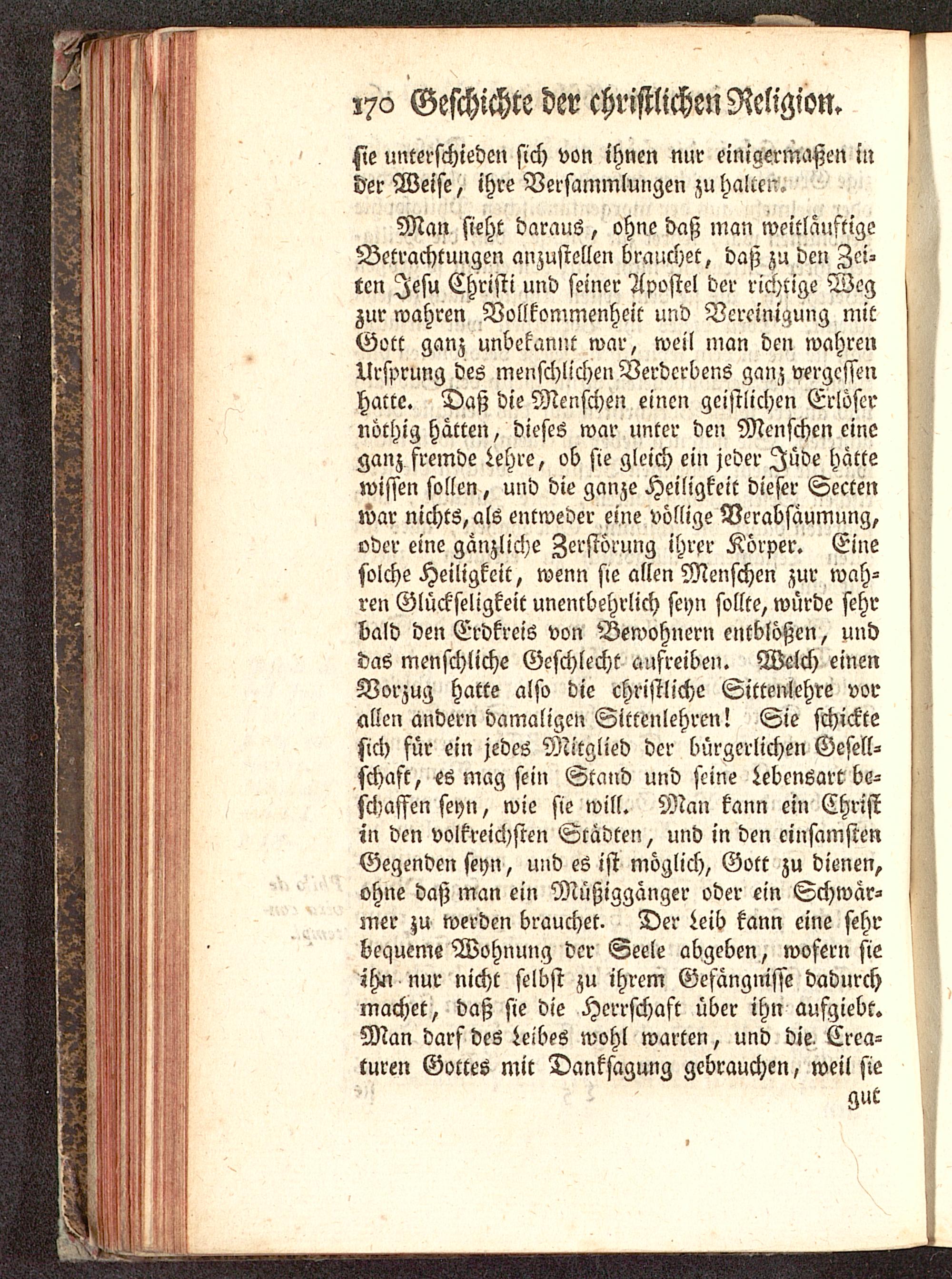 Man sieht daraus, ohne daß man weitlaustigeBetrachtungen anzustellen brauchet, daß zu den Zei-ten Jesu Christi und seiner Apostel der richtige Wegzur wahren Vollkommenheit und Vereinigung mitGott ganz unbekannt war, weil man den wahrenUrsprung des menschlichen Verderbens ganz vergessenhatte. Daß die Menschen einen geistlichen Erlösernöthig hätten, dieses war unter den Menschen eineganz fremde lehre, ob sie gleich ein jeder Jude hättewissen sollen, und die ganze Heiligkeit dieser Sectenwar nichts, als entweder eine völlige Vcrabsäumung,oder eine gänzliche Zerstörung ihrer Körper. Einesolche Heiligkeit, wenn sie allen Menschen zur wah-ren Glückseligkeit unentbehrlich seyn sollte, würde sehrbald den Erdkreis von Bewohnern entblößen, unddas menschliche Geschlecht aufreiben. Welch einenVorzug hatte also die christliche Sittenlehre vorallen andern damaligen Sittenlehrcn! Sie schicktesich für ein jedes Mitglied der bürgerlichen Gesell-schaft, es mag sein Stand und seine Lebensart be-schaffen seyn, wie sie will. Man kann ein Christin den volkreichsten Städten, und in den einsamstenGegenden seyn, und es ist möglich, Gott zu dienen,ohne daß man ein Müßiggänger oder ein Schwär-mer zu werden brauchet- Der Leib kann eine sehrbequeme Wohnung der Seele abgeben , wofern sieihn nur nicht selbst zu ihrem Gefängnisse dadurchmachet, daß sie die Herrschaft über ihn aufgiebt.Man darf des Leibes wohl warten, und die Crea-turen Gottes mit Danksagung gebrauchen, weil sie