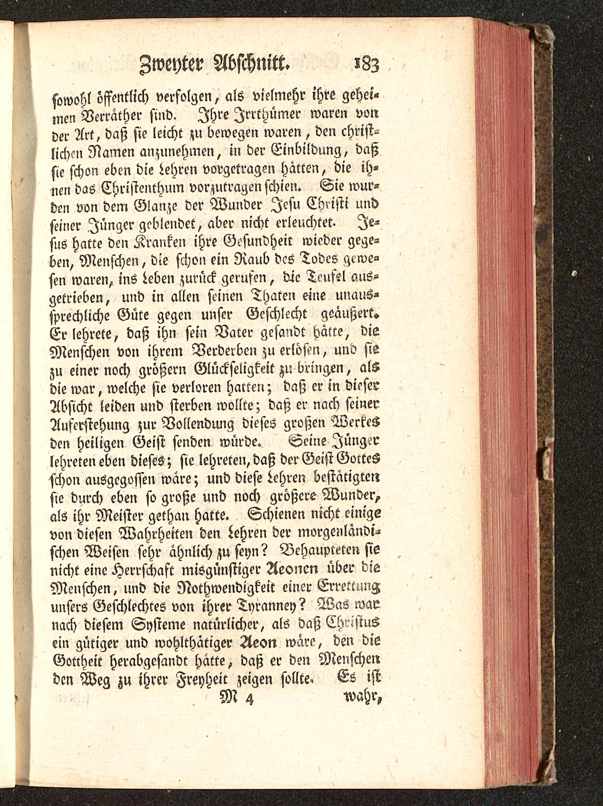 sowohl öffentlich verfolgen, als vielmehr ihre gehei-men Verräther sind. Ihre Irrthümer waren vonder Art, daß sie leicht zu bewegen waren, den christ-lichen Namen anzunehmen, in der Einbildung, daßsie schon eben die Lehren vorgetragen hatten, die ih-nen das Christenthum vorzutragen schien. Sie wur-den von dem G!anze der Wunder Jesu Chn'sti undseiner Jünger geblendet, aber nicht erleuchtet. Je-sus hatte den Kranken ihre Gesundheit wieder gege-ben, Menschen, die schon ein Raub des Todes gewe-sen waren, ins Leben zurück gerufen, die Teufel alls-getrieben, und in allen seinen Thateil eine unaus-sprechliche Güte gegen unser Geschlecht geäußert»Er lehrete, daß ihn sein Vater gesandt hatte, dieMenschen von ihrem Verderben zu erlösen, und siezu einer noch größern Glückseligkeit zu bringen, alsdie war, welche sie verloren hatten; daß er in dieserAbsicht leiden und sterben wollte; daß er nach seinerAuferstehung zur Vollendung dieses großen Werkesden heiligen Geist senden würde. Seine Jüngerlehreten eben dieses; sie lehreten, daß der Geist Gottesschon auögcgosfen wäre; und diese Lehren bestätigtensie durch eben so große und noch größere Wunder,als ihr Meister gethan hatte. Schienen nicht einigevon diesen Wahrheiten den Lehren der morgenländi-sehen Weisen sehr ähnlich zu seyn? Behaupteten sienicht eine Herrschaft misgünstiger Aeonen über dieMenschen, und die Nothwendigkeit einer Errettungunsers Geschlechtes von ihrer Tvranney? Was waenach diesem Systeme natürlicher, als daß Ch' istusein gütiger und wohlthätiger Aeon wäre, den dieGottheit herabgesandt hätte, daß er den Menschenden Weg zu ihrer Freyheit zeigen sollte. Es ist