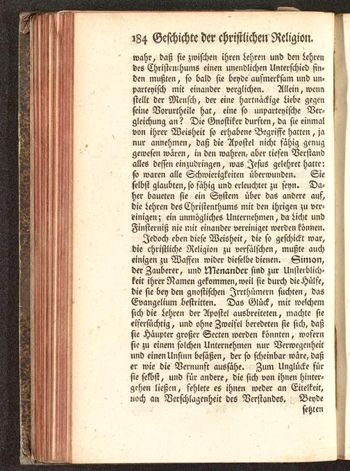Jedoch eben diefe Weisheit, die so geschickt war,die christliche Religion zu verfälschen, mußte aucheinigen zu Waffen wider dieselbe dienen. Simon,der Zauberer, und Nlenander sind zur Unsterblich-keit ihrer Namen gekommen, weil sie durch die Hülfe,die sie bey den gnostischen Irrthümern suchten, dasEvangelium bestritten. Das Glück, mit welchemsich die Lehren der Apostel ausbreiteten, machte sieeifersüchtig, und ohne Zweifel beredeten sie sich, daßsie Häupter großer Seccen werden könnten, wofernsie zu einem solchen Unternehmen nur Verwegenheitund einen Unsinn besäßen, der so scheinbar wäre, daßer wie die Vernunft aussähe. Zum Unglücke fürsie selbst, und für andere, die sich von ihnen hinter-gehen ließen, fehlete es ihnen weder an Eitelkeit,noch an Verschlagenheit des Verstandes. Beyde