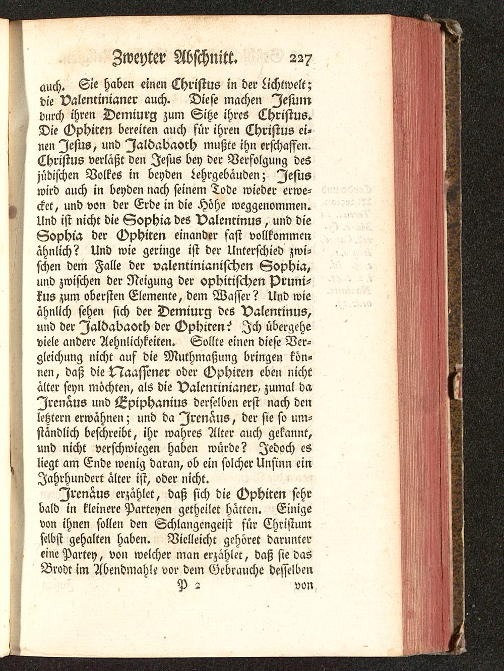 auch. Sie haben einen Christus in der iichtwelt;die Valeminianer auch. Diese machen Jesumdurch ihren Deiniurg zum Sihe ihres Christus.Die (Dphiren bereiten auch für ihren Christus ei-nen Jesus, und Jaldadaorh mußte ihn erschaffen.Christus verlaßt den Jesus bey der Verfolgung desjüdischen Volkes in beyden Lehrgebäuden; Jesus wird auch in beyden nach seinem Tode wieder erwe-cket, und von der Erde in die Höhe weggenommen.Und ist nicht die Sophia des Valeminus, und dieSophia der (Dphiren einander fast vollkommenähnlich? Und wie geringe ist der Unterschied zwi-schen dem Falle der valentinianischen Sophia,und zwischen der Neigung der ophirischen pruni-kus zum obersten Elemente, dem Wasser? Und wieähnlich sehen sich der Demiurg des Valeminus,und der Ialdabaorh der Gphiten? Ich übergeheviele andere Aehnlichkeiten. Sollte einen diese Ver-gleichung nicht auf die Muthmaßung bringen kön«neu, daß die j^7aassener oder E>phicen eben nichtälter seyn möchten, als die Valeminianer, zumal daIrenaus und Apiphanius derselben erst nach denletztem erwähnen; und da Irenaus , der sie so um-ständlich beschreibt, ihr wahres Alter auch gekannt,und nicht verschwiegen haben würde? Jedoch esliegt am Ende wenig daran, ob ein solcher Unsinn einJahrhundert alter ist, oder nicht.