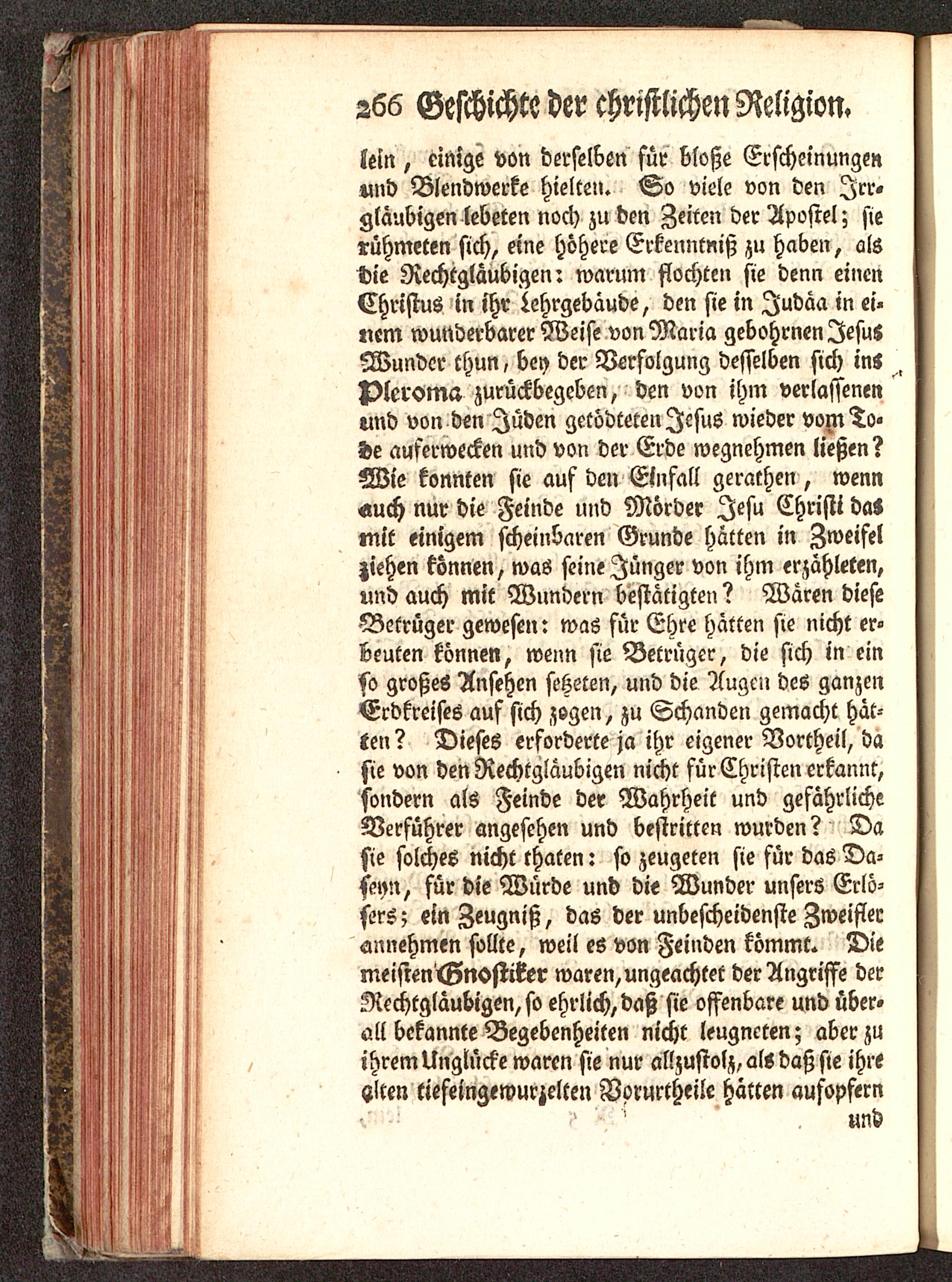 lein, einige von derselben für bloße Erscheinungenund Blendwerke hielten. So viele von den Irr«gläubigen lebeten noch zu den Zeiten der Apostel; sierühmeten sich, eine höhere Erkenntniß zu haben, alsdie Rechtgläubigen: warum flochten sie denn einenChristus in ihr Lehrgebäude, den sie in Iudäa in ei-nem wunderbarer Weise von Maria gebohrnen JesusWunder thun, bey der Verfolgung desselben sich insNlcroma zurückbegeben, den von ihm verlassenenund von den Juden getödteten JcsuS wieder vom To-de auferwecken und von der Erde wegnehmen ließen?Wie konnten sie auf den Einfall gerathen , wenn«uch nur die Feinde und Mörder Jesu Christi dasmit einigem scheinbaren Grunde hätten in Zweifelziehen können, was seine Jünger von ihm erzähleten,und auch mit Wundern bestätigten? Waren dieseBetrüger gewesen: was für Ehre hätten sie nicht er-beuten können, wenn sie Betrüger, die sich in einso großes Ansehen seßeten, und die Augen des ganzenErdkreises auf sich zogen, zu Schanden gemacht hat-ten ? Dieses erforderte ja ihr eigener Vortheil, dasie von den Rechtgläubigen nicht für Christen erkannt,sondern als Feinde der Wahrheit und gefährlicheVerführer angesehen und bestricken wurden? Dasie solches nicht thaten: so zeugeten sie für das Da-seyn, für die Würde und die Wunder unsers Erlö-sers; ein Zeugniß, das der unbescheidenste Zweiflerannehmen sollte, weil es von Feinden kömmt. DiemeisienEnostiker waren, ungeachtet der Angrisse derRechtgläubigen, so ehrlich, daß sie offenbare und über-oll bekannte Begebenheiten nicht leugneten; aber zuihrem Unglücke waren sie nur allzustolz, als daß sie ihre»Iten tiefeingewurjelten Vorurtheile hätten aufopfern