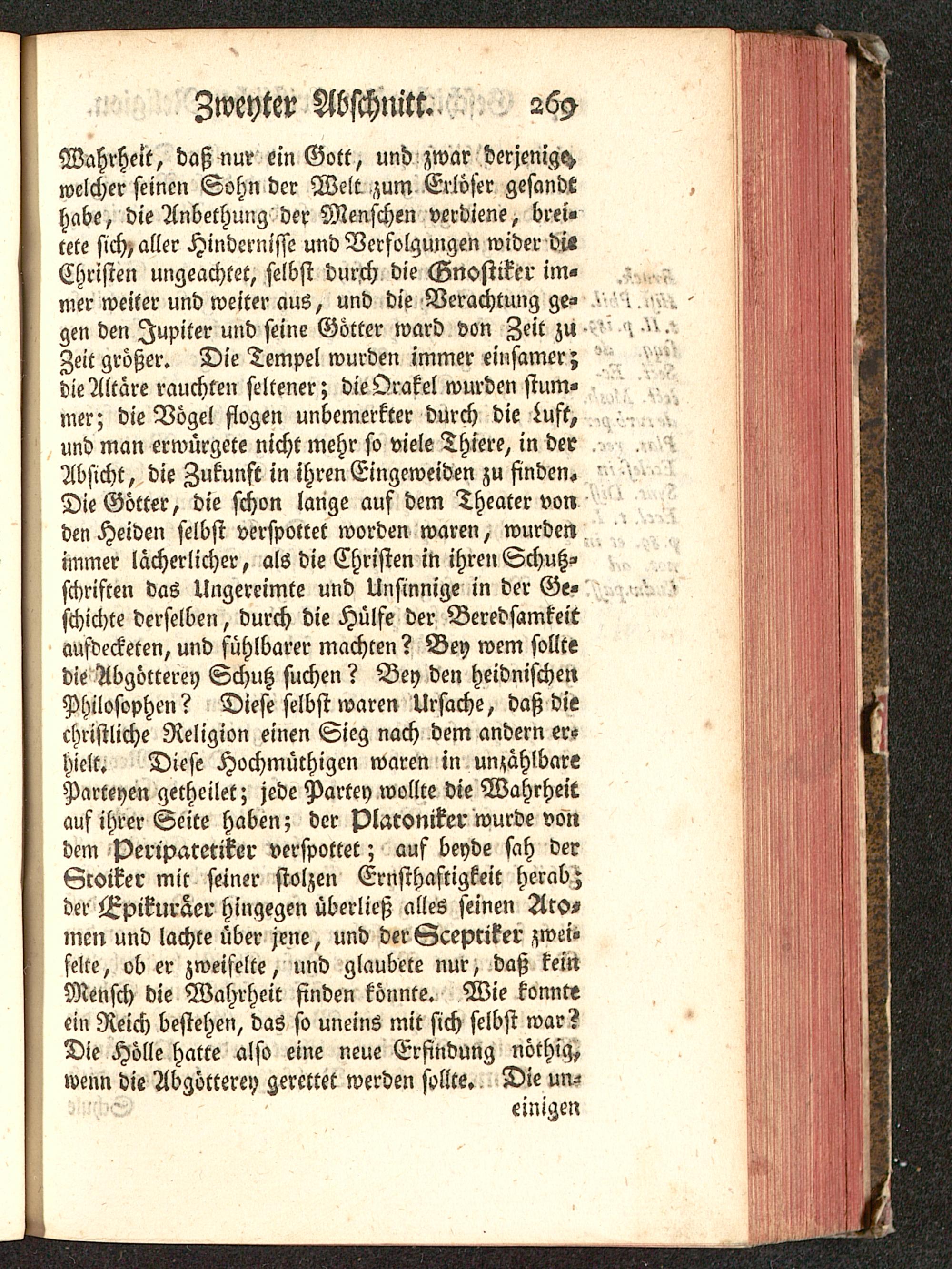 Wahrheit, daß nur ein Gott, und zwar derjenigewelcher seinen Sohn der Welt, zum Erlöser gesandt ,habe, die Anbethung der Menschen verdiene, brei-tete sich) aller Hindernisse und Verfolgungen wider di«Christen ungeachtet, selbst durch die Gnostiker im-mer weiter und weiter aus, und die Verachtung ge- .gen den Jupiter und seine Götter ward von Zeit zu .Zeit größer. Die Tempel wurden immer einsamer ;die Altäre rauchten seltener; die Orakel wurden stum-mer; die Vögel flogen unbemerkter durch die Luft,und man erwürgete nicht mehr so viele Thiere, in derAbsicht, die Zukunft in ihren Eingeweiden zu finden« ' v-Die Götter, die schon lange auf dem Theater vonden Heiden selbst verspottet worden waren, wurdenimmer lächerlicher, als die Christen in ihren Schutz-schriften das Ungereimte und Unsinnige in der Ge-schichte derselben, durch die Hülfe der Beredsamkeitaufdecketen, und fühlbarer machten? Bey wem solltedie Abgötterey Schutz suchen? Bey den heidnischenPhilosophen? Diese selbst waren Ursache, daß diechristliche Religion einen Sieg nach dem andern er-hielt. Diese Hochmüthigen waren in unzählbareParteyen getheilet; jede Partey wollte die Wahrheitauf ihrer Seite haben; der plaeoniker wurde vondem peripareriker verspottet; auf beyde sah derStoiker mit seiner stolzen Ernsthaftigkeit herab;der Epikuräer hingegen überließ alles seinen Ato-men und lachte über jene, und der Gcepriker zwei-felte, ob er zweifelte, und glaubete nur, daß keinMensch die Wahrheit finden könnte. Wie konnteein Reich bestehen, das so uneins mit sich selbst war?Die Hölle hatte also eine neue Erfindung nöthig,wenn die Abgötterey gerettet werden sollte. Die un-einigen