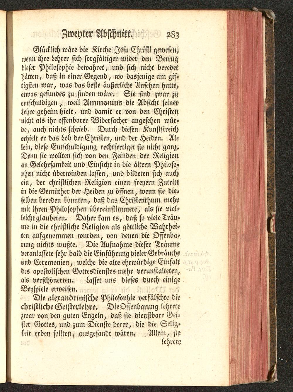 Glücklich wäre die Kirche Jesu Christi gewesenwenn ihre Lehrer sich sorgfältiger mider den Betrugdieser Philosophie bewahret, und sich nicht beredethätten, daß in einer Gegend, wo dasjenige am gif-tigsten war, was das beste äußerliche Ansehen hatte,etwas gesundes zu finden wäre. Sie sind zwar zuentschuldigen, weil AmmoniuS die Absicht seinerLehre geheim hielt, und damit er von den Christennicht als ihr offenbarer Widersacher angesehen wür-de, auch nicdts schrieb. Durch diesen Kunststreicherhielt er das Lob der Christen, und der Heiden. Al-lein, diese Entschuldigung rechtfertiget sie nicht ganz.Denn sie wollten sich von den Feinden der Religionan Gelehrsamkeit und Einsicht in die ältern Philoso-phen nicht überwinden lassen, und bildeten sich auchein, der christlichen Religion einen freyern Zutrittin die Gemüther der Heiden zu öffnen, wenn sie die-selben bereden könnten, daß das Christenthum mehrmit ihren Philosophen übereinstimmete, als sie viel-leicht glaubeten. Daher kam es, daß so viele Trau-me in die christliche Religion als göttliche Wahrhei-ten aufgenommen wurden, von denen die Offenba-rung nichts wußte. Die Aufnahme dieser Träumeveranlassete sehr bald die Einführung vieler Gebräucheund Ceremonien, welche die alte ehrwürdige Einfaltdes apostolischen Gottesdienstes mehr verunstalteten,als verschönerten. Lasset uns dieses durch einigeBeyspiele erweisen. >