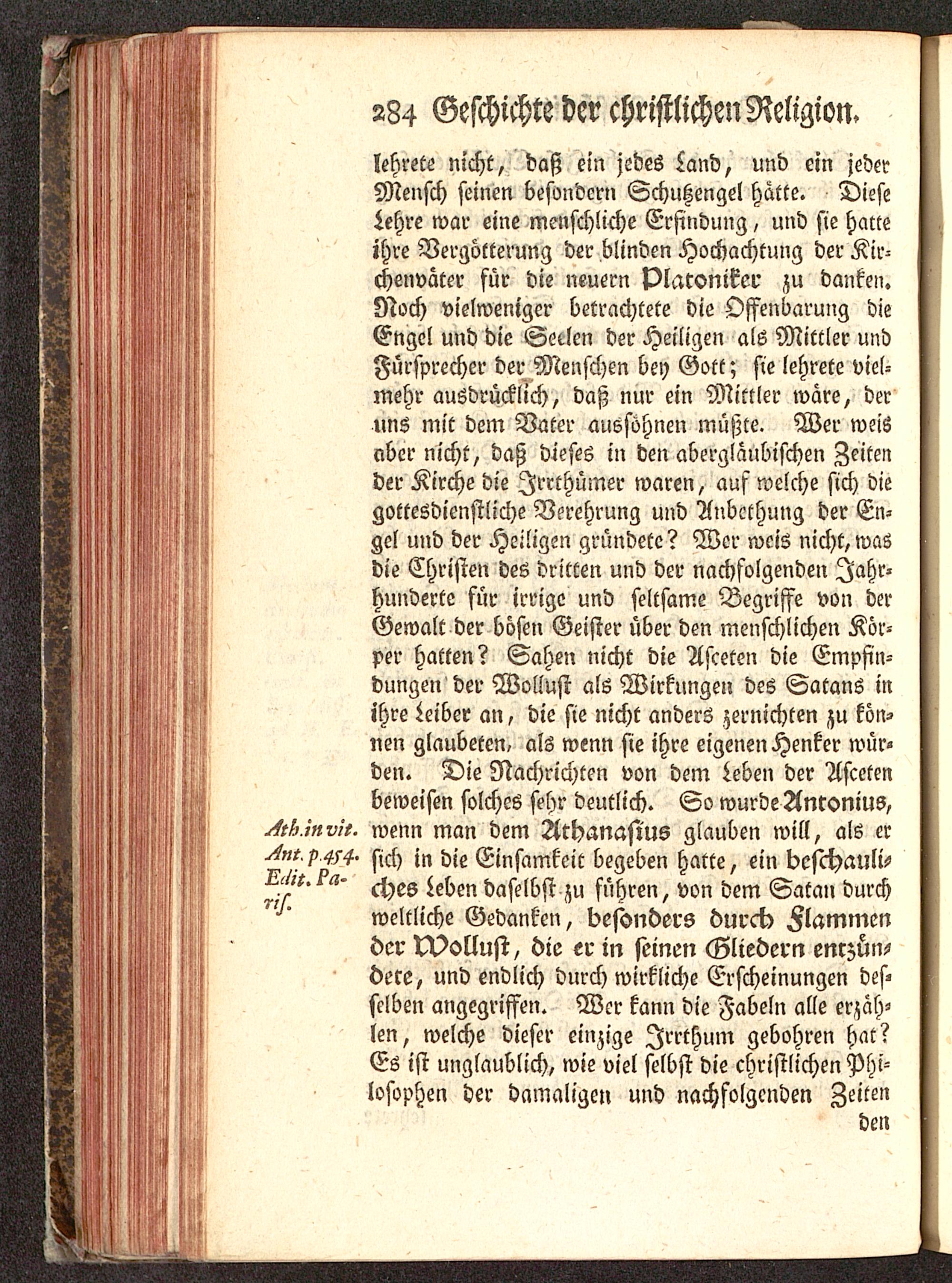 lehrete nicht, daß ein jedes Land, und ein jederMensch seinen besondern Schußengel hatte. DieseLehre war eine menschliche Erfindung, und sie harteihre Vergötterung der blinden Hochachtung der Kir-chenvater für die neuern platoniker zu danken.Noch vielweniger betrachtete die Offenbarung dieEngel und die Seclen der Heiligen als Mittler undFürsprecher der Menschen bey Gott; sie lehrete viel-mehr ausdrücklich, daß nur ein Mittler wäre, deruns mit dem Vater aussöhnen müßte. Wer weisaber nicht, daß dieses in den abergläubischen Zeitender Kirche die Irrthümer waren, auf welche sich diegottesdienstliche Verehrung und Anbcthung der En-gel und der Heiligen gründete? Wer weis nicht, wasdie Christen des dritten und der nachfolgenden Jahr-hunderte für irrige und seltsame Begriffe von derGewalt der bösen Geister über den menschlichen Kör-per hatten? Sahen nicht die Asceten die Empfin-dungen der Wollust als Wirkungen des Satans inihre Leiber an, die sie nicht anders zernichten zu kön-nen glaubeten, als wenn sie ihre eigenen Henker wür-den. Die Nachrichten von dem Leben der Ascetenbeweisen solches sehr deutlich. So wurde Anconius,wenn man dem Athanasius glauben will, als er