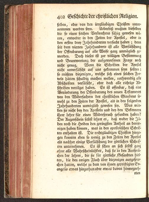 selben, oder von den irrgläubigen Christen unter-nommen worden seyn. Ueberdiß mußten dieselbendie so eines solchen Verbrechens fähig gewesen wä^rcn, entweder in den Zeiten der Apostel, oder inden ersten drey Jahrhunderten versucht haben ; dennseit dem vierten Jahrhunderte ist alle Verfälschungder Offenbarung auf alle Weife ganz unmöglich ge-worden. Doch dieses ist zur völligen Bestimmungund Beantwortung der aufgeworfenen Frage nochnicht genug. Wenn die Schriften der Apostelnicht unverfälscht auf uns gekommen seyn sollten:so müßten diejenigen, welche sich eines solchen Fre-vels hätten schuldig machen wollen, nothwendig alleAbschriften verfälscht, oder doch alle richtige Ab-schriften vertilget haben. Es ist offenbar, daß eineVeränderung der Offenbarung des neuen Testamentsvon den Widersachern des christlichen Glaubens so-wohl zu den Zeiten der Apostel, als in den folgendenJahrhunderten unmöglich gewesen sey. Was wür-den sie nicht bey den Aposteln und bey den Bekenncrnihrer Lehre für einen Widerspruch gefunden haben?Der Augenschein selbst lehret es, daß weder die Ju-den noch die Heiden den geringsten Antheil an demje-nigen haben können, was in den apostolischen Schrif-ten enthalten ist. Die rechtgläubigen Christen hinge-gen konnten eben so wenig zu den Zeiten der Apostelals nachher einige Verfälschung der göttlichen Schrif-ten unternehmen. Es ist schon an sich selbst ganzohne alle Wahrscheinlichkeit, daß sie in den Ausfprü-chen der Lehrer, die sie für göttliche.Gesandten hiel-ten, die den ewigen Fluch über diejenigen ausgespro-chen hatten, welche zu dem von ihnen gepredigten Ev-angelio etwas hinzuthun oder etwas davon hinwegneh-men