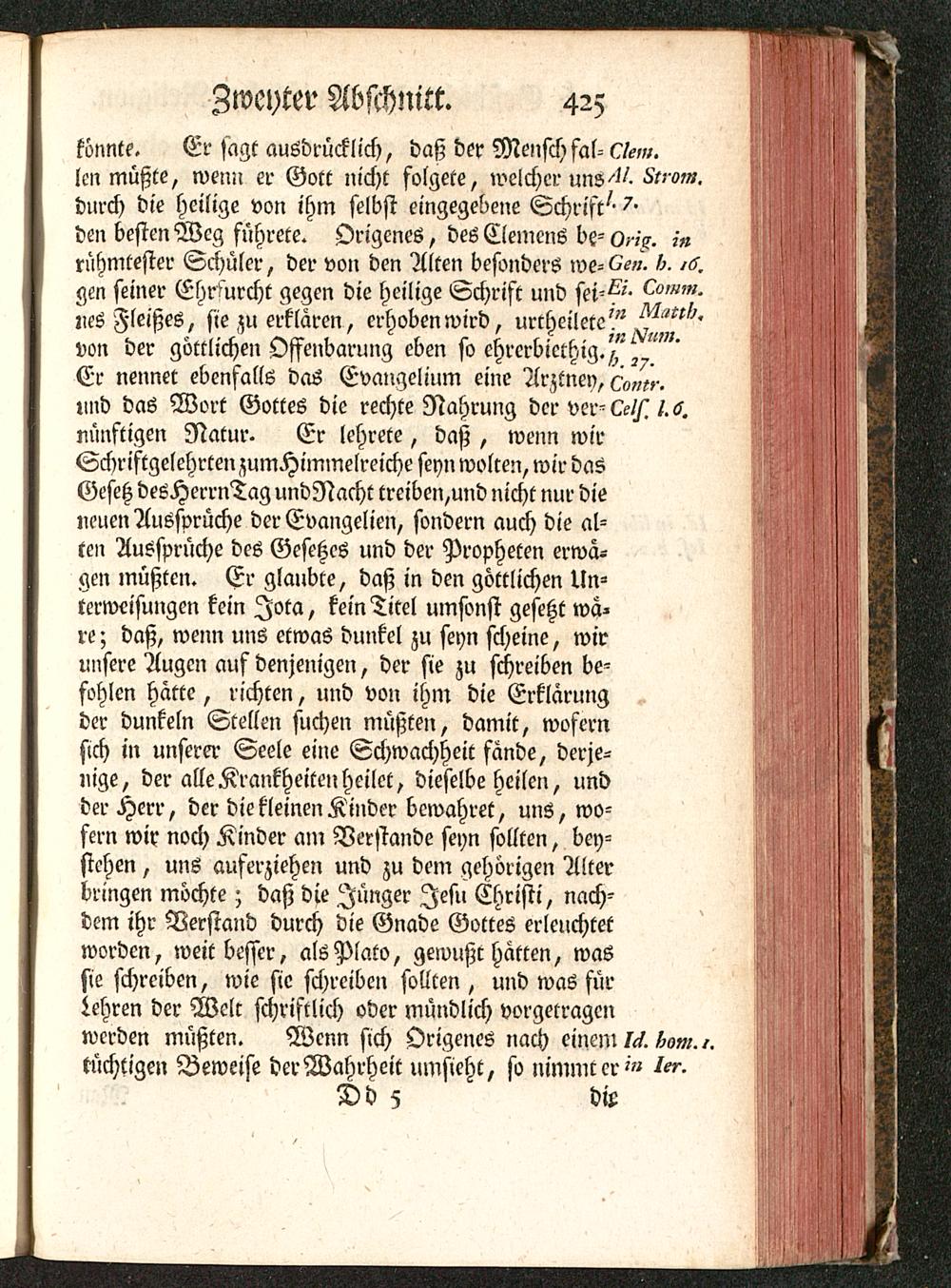 konnte. Er sagt ausdrücklich, daß der Mensch fal- t?/-,„.len müßte, wenn er Gott nicht folgete, welcher uns ^- 5"om.durch die heilige von ihm selbst eingegebene Schrift^ ^den besten Weg führete. Origenes , des Clemens be- i«rühmtester Schüler, der von den Alten besonders we-Le». /-5.gen seiner Ehrwrcht gegen die heilige Schrift und sei^-nes Fleißes, sie zu erklären, erhoben wird, urcheilete^^^'von der göttlichen Offenbarung eben so ehrerbiethig.^'^.'Er nennet ebenfalls das Evangelium eine Arztney,und das Wort Gottes die rechte Nahrung der ver-Q//nünftigen Natur. Er lehrete, daß, wenn wirSchriftgelehrtenzumHimmelreiche seyn wolten, wir dasGesetz desHerrnTag undNacht treiben,und nicht nur dieneuen Aussprüche der Evangelien, sondern auch die al-ten Aussprüche des Gesetzes und der Propheten erwä-gen müßten. Er glaubte, daß in den göttlichen Un-terweisungen kein Jota, kein Titel umsonst gesetzt wä-re; daß, wenn uns etwas dunkel zu seyn scheine, wirunsere Augen auf denjenigen, der sie zu schreiben be-fohlen hätte, richten, und von ihm die Erklärung .der dunkeln Stellen suchen müßteil, damit, wofernsich in unserer Seele eine Schwachheit fände, derje-nige, der alle Krankheiten heilet, dieselbe heilen, undder Herr, der die kleinen Kinder bewahret, uns, wo-fern wir noch Kinder am Verstände seyn sollten, bey-stehen , uns auferziehen und zu dem gehörigen Alterbringen möchte; daß die Jünger Jesu Christi , nach-dem ihr Verstand durch die Gnade Gottes erleuchtetworden, weit besser, als Plato, gewußt hätten, wassie schreiben, wie sie schreiben sollten , und was fürLehren der Welt schriftlich oder mündlich vorgetragenwerden müßten. Wenn sich Origenes nach einem6om.tüchtigen Beweise der Wahrheit umsieht, so nimmt er?'»