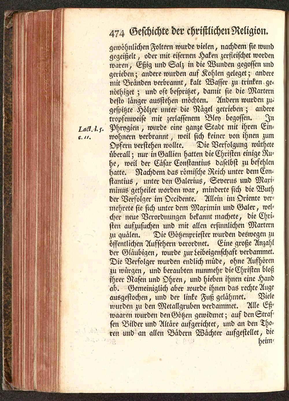 Opfern verstehen wollte. Die Verfolgung wütheteüberall; nur in Gallien hatten die Christen einige Ru-he, weil der Cäsar Constantius daselbst zu befehlenhatte. Nachdem das römische Reich unter dem Con-stantius , unter den Galeriuö, Severus und Mari-minus getheilet worden war, minderte sich die Wuthder Verfolger im Occidente. Allein im Oriente ver-mehrte sie sich unter dem Marimin und Galer, wel-cher neue Verordnungen bekannt machete, die Chri-sten aufzusuchen und mit allen ersinnlichen Marternzu quälen. Die Gö.tzenpriester wurden deswegen zuöffentlichen Aufsehern verordnet. Eine große Anzahlder Glaubigen, wurde zur Leibeigenschaft verdammet.Die Verfolger wurden endlich müde, ohne Aufhörenzu würgen, und beraubten nunmehr die Christen bloßihrer Nasen und Ohren, und hieben ihnen eine Handab. Gemeiniglich aber wurde ihnen das rechte Augeausgestochen, und der linke Fuß gelähmer. Vielewurden zu den Metallgruben verdammet. Alle Eß-waaren wurden den Götzen gewidmet; auf den Stras-sen Bilder und Altäre aufgerichtet, und an den Tho-ren und an allen Bädern Wächter aufgestellet, die