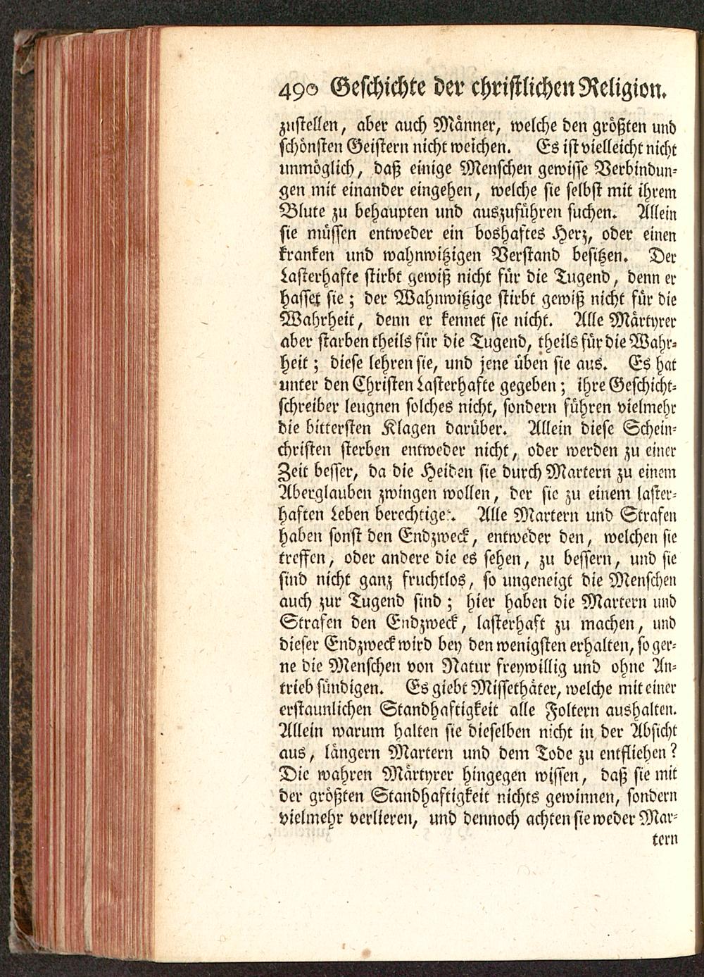 zustellen, aber auch Männer, welche den größten undschönsten Geistern nicht weichen. Es ist vielleicht nichtunmöglich, daß einige Menschen gewisse Verbindun-gen mit einander eingehen, welche sie selbst mit ihremBlute zu behaupten und auszuführen suchen. Alleinsie müssen entweder ein boshaftes Herz, oder einenkranken lind wahnwitzigen Verstand besitzen. DerLasterhafte stirbt gewiß nicht für die Tugend, denn erhasset, sie; der Wahnwitzige stirbt gewiß nicht für dieWahrheit, denn er kennet sie nicht. Alle Märtyreraber starben theils für die Tugend, theils für die Wahr-heit ; diese lehren sie, und jene üben sie aus. Es hatunter den Christen Lasterhafte gegeben; ihre Geschicht-schreiber leugnen solches nicht, sondern führen vielmehrdie bittersten Klagen darüber. Allein diese Schein-christen sterben entweder nicht, oder werden zu einerZeit besser, da die Heiden sie durch Martern zu einemAberglauben zwingen wollen, der sie zu einem laster-haften Leben berechtige-. Alle Martern und Strafenhaben sonst den Endzweck, entweder den, welchen sietreffen, oder andere die es sehen, zu bessern, und siesind nicht ganz fruchtlos, so ungeneigt die Menschenauch zur Tugend sind ; hier haben die Martern undStrafen den Endzweck, lasterhaft zu machen, unddieser Endzweck wird bey den wenigsten erhalten, so ger-ne die Menschen von Natur freywillig und ohne An-trieb sundigen. Es giebt Missethater, welche mit einererstaunlichen Standhaftigkeit alle Foltern aushalten.Allein warum halten sie dieselben nicht in der Absichtaus, längern Marter:? und dem Tode zu entfliehen?Die wahren Märtyrer hingegen wissen, daß sie mitder größten Standhaftigkeit nichts gewinnen, sondernVielmehr verlieren, und dennoch achten sie weder Mar-tern