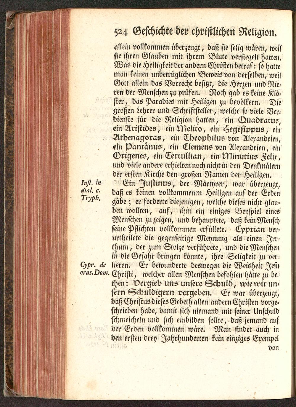 allein vollkommen überzeugt, daß sie selig waren, weilsie ihren Glauben mit ihrem Blute versiegelt hatten.Was die Heiligkeit der andern Christen betraf: so hatteman keinen unbetrüglichen Beweis von derselben, weilGott allein das Vorrecht besHt, die Herzen und Nie-ren der Menschen zu prüfen. Noch gab es keine Klö-ster, das Paradies mit Heiligen zu bevölkern. Diegroßen Lehrer und Schriftsteller, welche so viele Ver-dienste für die Religion hatten, ein Duadraru?,einAristides, ein Meliro, ein Hegesippus, einArhenagoras, ein TheopKilus von Alerandrien,ein pamanus, ein Clemens von Alerandrien, cmOrigenes , ein Tercullian, ein Minmius Felix,und viele andere erhielten noch nicht in den Denkmalernder ersten Kirche den großen Namen der Heiligen./»/?.?'« Ein Iustinus, der Märtyrer, war überzeugt,c. xg keinen vollkommenen Heiligen auf der Erden' gäbe; er forderte diejenigen, welche dieses nicht glau-ben wollten, auf, ihm ein einiges Beyspiel einesMenschen zu zeigen, und behauptete, daß kein Menschseine Pflichten vollkommen erfüllete. Cyprian ver-urtheilete die gegenseitige Meynung als einen Irr-thum, der zum Stolze verführete, und die Menschenin die Gefahr bringen könnte, ihre Seligkeit zu ver-H,/>^. <K lieren. Er bewunderte deswegen die Weisheit Jesuo---?,.Oom. Christi, welcher allen Menschen befohlen hätte zu be-then: Vergieb uns unsere Schuld, wiewirun«fern Geduldigern vergeben. Er war überzeugt,daß Christus dieses Gebeth allen andern Christen vorge-schrieben habe, damit sich niemand mit seiner Unschuldschmeicheln und sich einbilden sollte, daß jemand aufder Erden vollkommen wäre. Man findet auch inden ersten drey Jahrhunderten kein einziges Erempel