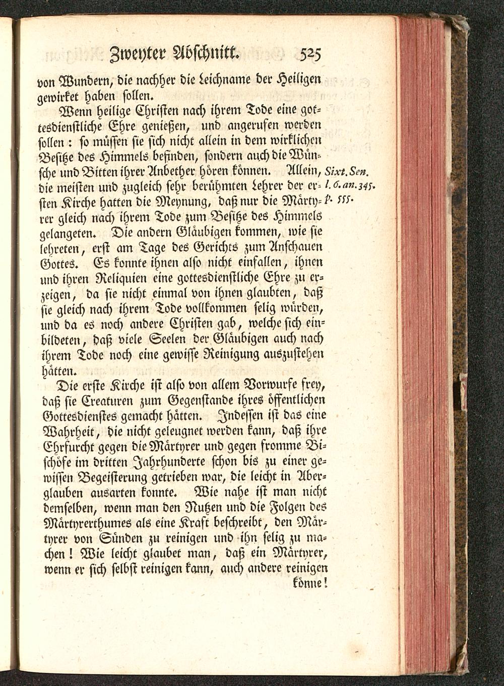 Wenn heilige Christen nach ihrem Tode eine got-tesdienftliche Ehre genießen, und angerufen werdensollen : so müssen sie sich nicht allein in dem wirklichenBesHe des Himmels befinden, sondern auch die Wün--sehe und Bitten ihrer Anbether hören können. Allein, 5/^. 5-die meisten und zugleich sehr berühmten Lehrer der er- /.6>^».sim Kirche hatten die Meynung, daß nur die Märty-/'- M-rcr gleich nach ihrem Tode zum Besitze des Himmelsgelangeten. Die andern Gläubigen kommen, wie sielehreten, erst am Tage des Gerichts zum AnschauenGottes. Es konnte ihnen also nicht einfallen, ihnenund ihren Reliquien eine gottesdienstliche Ehre zu er-zeigen, da sie nicht einmal von ihnen glaubten, daßsie gleich nach ihrem Tode vollkommen selig würden,und da es noch andere Christen gab, welche sich ein-bildeten, daß viele Seelen der Gläubigen auch nachihrem Tode noch eine gewisse Reinigung auszustehenhatten.