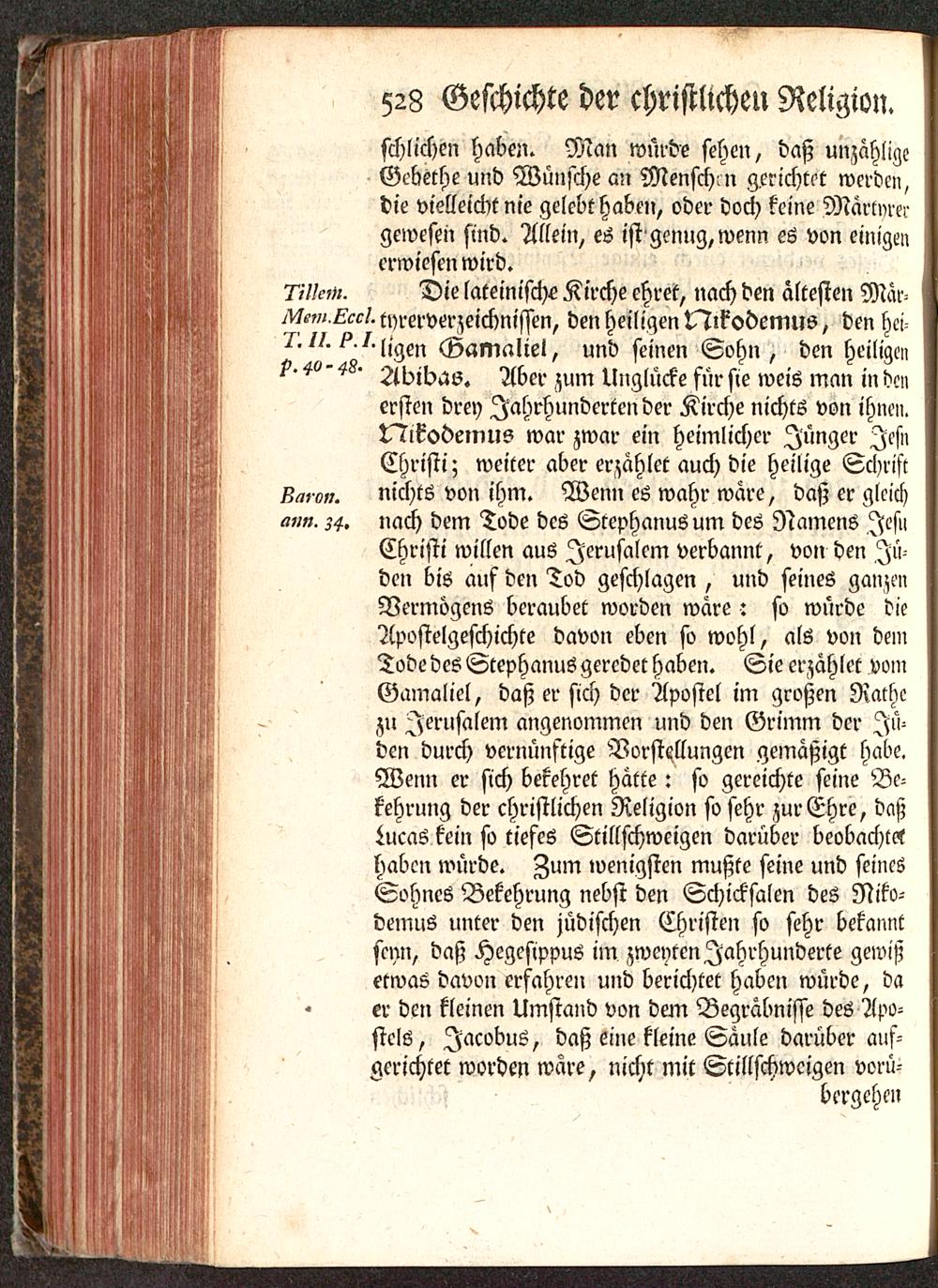 NV/t-M. Die lateinische Kirche ehret, nach den ältesten Mär-/p/t>?",^c/. tyrerverzeichnissen, den heiligen Nikodemus , den hci-?.//./>./. liM Gamaliel, und seinen Sohn, den heiligen/>. 40 - -z-8- Akjb^ M^. Unglücke für sie weis man in denersten drey Jahrhunderten der Kirche nichts von ihnen,t^ikodemus war zwar ein heimlicher Jünger IesnChristi; weiter aber erzählet auch die heilige Schrift66,-0». nichts von ihm. Wenn es wahr wäre, daß er gleich^. nach dem Tode des Scephanus um des Namens IesnChristi willen aus Jerusalem verbannt, von den Iü-den bis auf den Tod geschlagen , und seines ganzenVermögens beraubet worden wäre: so würde dieApostelgeschichte davon eben so wohl, als von demTode des Stephanus geredet haben. Sie erzahlet vomGamaliel, daß er sich der Apostel im großen Rathezu Jerusalem angenommen und den Grimm der Ju-den durch vernünftige Vorstellungen gemäßigt habe.Wenn er sich bekehret hatte: so gereichte seine Be-kehrung der christlichen Religion so sehr zur Ehre, daßLucas kein so tiefes Stillschweigen darüber beobacht«haben würde. Zum wenigsten mußte seine und seinesSohnes Bekehrung nebst den Schicksalen des Niko-demus unter den jüdischen Christen so sehr bekanntseyn, daß Hegesippus im zweyten Jahrhunderte gewißetwas davon erfahren und berichtet haben würde, daer den kleinen Umstand von dem Begräbnisse des Apo-stels, Jacobus, daß eine kleine Säule darüber auf-gerichtet worden wäre, nicht mit Stillschweigen vorü-bergehen