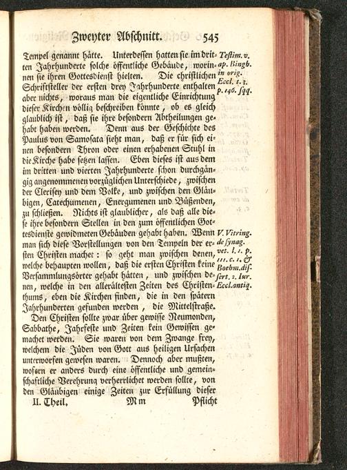Tempel genannt hätte. Unterdessen hatten sie im drit- 7e/?,>„. v.ten Jahrhunderte solche öffentliche Gebäude, worin-^-nen sie ihren Gottesdienst hielten. Die christlichen ^Schriftsteller der ersten drey Jahrhunderte enthalten"^aber nichts, woraus man die eigentliche Einrichtung ^dieser Kirchen völlig beschreiben könnte, ob e6 gleichglaublich ist, daß sie ihre besondern Abtheilungen ge-habt haben werden. Denn auö der Geschichte desPaulus von Samosata sieht man, daß er für sich ei-nen besondern Thron oder einen erhabenen Stuhl indie Kirche habe sehen lassen. Eben dieses ist aus demim dritten und vierten Jahrhunderte schon durchgän-gig angenommenen vorzüglichen Unterschiede, zwischender Clerisey und dem Volke, und zwischen den Gläu-bigen, Catechumenen, Energumenen und Büßenden,zu schließen. Nichts ist glaublicher, als daß alle die-se ihre besondern Stellen in den zum öffentlichen Got-tesdienste gewidmeten Gebäuden gehabt haben. Wennman sich diese Vorstellungen von den Tempeln der er- ^A^s-sten Christen machet: so geht nmn zwischen denen,welche behaupten wollen, daß die ersten Christen keineVersammlungsörter gehabt hätten , und zwischen de-z /«^nen, welche in den allerältesten Zeiten des Christen-6cc/.a»?^.thumS, eben die Kirchen finden, die in den späternJahrhunderten gefunden werden , die Mittelstraße.