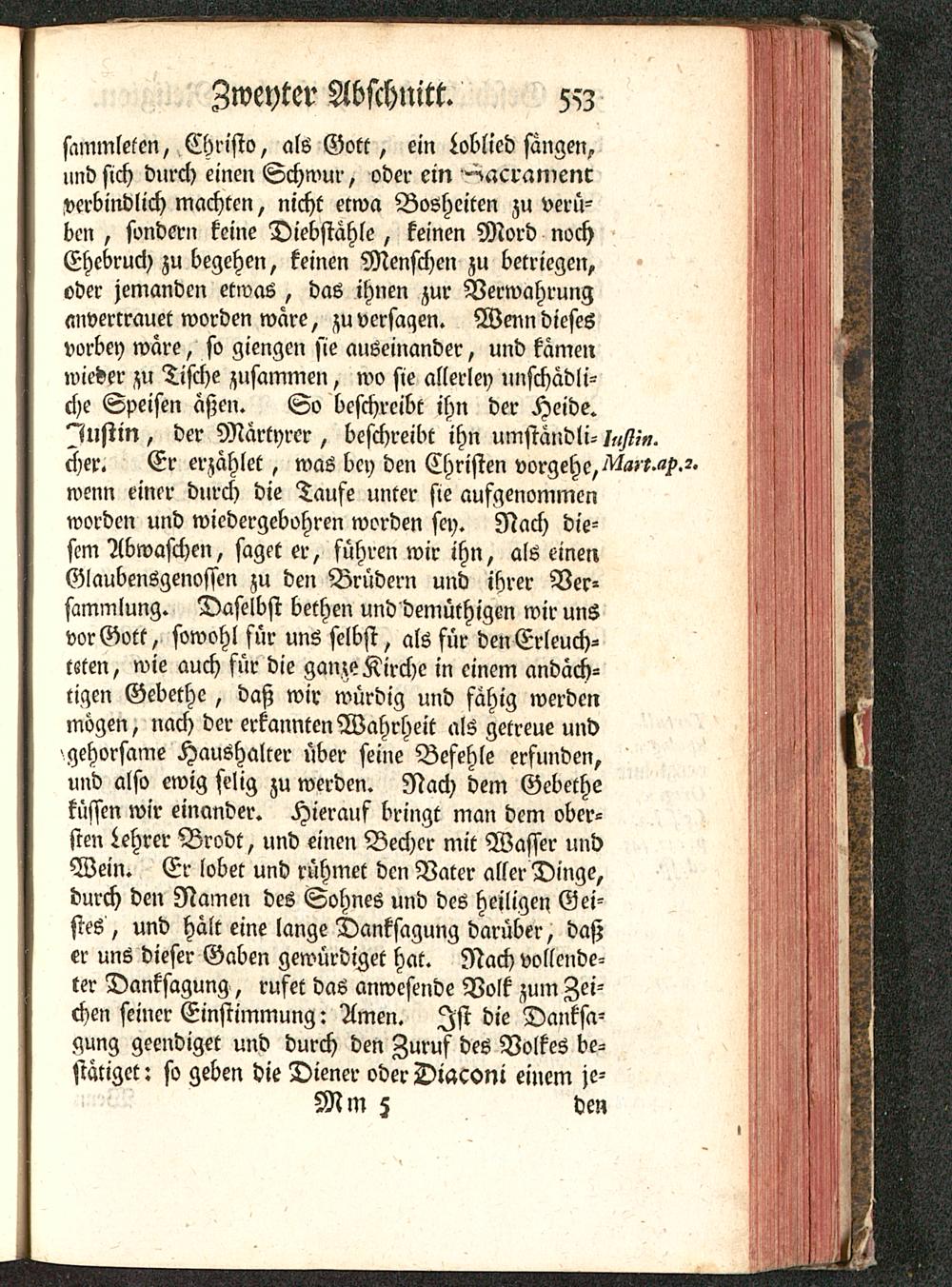 sammlelen, Christo, als Gott, ein Loblied sängen,und sich durch einen Schwur, oder ein '^acramencverbindlich machten, nicht etwa Bosheiten zu verü-ben , sondern keine Diebstahle, keinen Mord nochEhebruch zu begehen, keinen Menschen zu bekriegen,oder jemanden etwas, das ihnen zur Verwahrunganvertrauet worden wäre, zu versagen. Wenn diesesvorbey wäre, so giengen sie auseinander, und kämenwieder zu Tische zusammen, wo sie allerley unschädli-che Speisen äßen. So beschreibt ihn der Heide.Justin , der Märtyrer, beschreibt ihn umständli-/,</??>.eher. Er erzählet, was bey den Christen vorgehe,^»'t.«?.wenn einer durch die Taufe unter sie aufgenommenworden und wicdergebohren worden sey. Nach die-sem Abwäschen, saget er, führen wir ihn, als einenGlaubensgenossen zu den Brüdern und ihrer Ver-sammlung. Daselbst bethen und demüthigen wir unsvor Gott , sowohl für uns selbst, als für den Erleuch-ttten, wie auch für die ganze Kirche in einem andäch-tigen Gebethe, daß wir würdig und fähig werdenmögen, nach der erkannten Wahrheit als getreue undgehorsame Haushalter über seine Befehle erfunden,und also ewig selig zu werden. Nach dem Gebetheküssen wir einander. Hierauf bringt man dem ober-sten Lehrer Brodt, und einen Becher mit Wasser undWein. Er lobet und rühmet den Vater aller Dinge,durch den Namen des Sohnes und des heiligen Gei-stes , und hält eine lange Danksagung darüber, daßer uns dieser Gaben gewürdiget hat. Nach vollende-ter Danksagung , rufet das anwesende Volk zuin Zei-chen seiner Einstimmung: Amen. Ist die Danksa-gung geendiget und durch den Zuruf des Volkes be-stätiget : so geben die Diener oder Diaconi einem je-Mm 5 den
