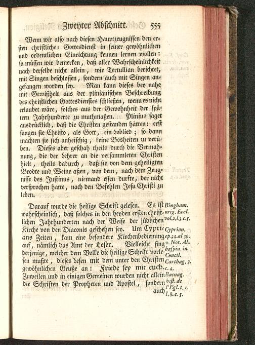 Darauf wurde die heilige Schrift gelesen. Es istwahrscheinlich, daß solches in den beyden erstenchrist- ""F-^/.lichen Jahrhunderten nach der Weise der jüdischen ^-^-5Kirche von den Diaconiö geschehen sey. Um Cyprl-^,/^,.ans Zeiten, kam eine besondere Kirchcnbedieming-'?,?^,??.auf, nämlich das Amt der Leser. Vielleicht fing^derjenige, welcher dem Volke die heilige Schrift vorle-A^'"sen mußte, dieses'Lesen mit dem unter den Christen <^/^ ^gewöhnlichen Gruße an: Friede sey mir eucd.c.^.Zuweilen und in einigen Gemeinen wurden nicht allein^'^^s.die Schriften der Propheten und Apostel, sondern ^/^^