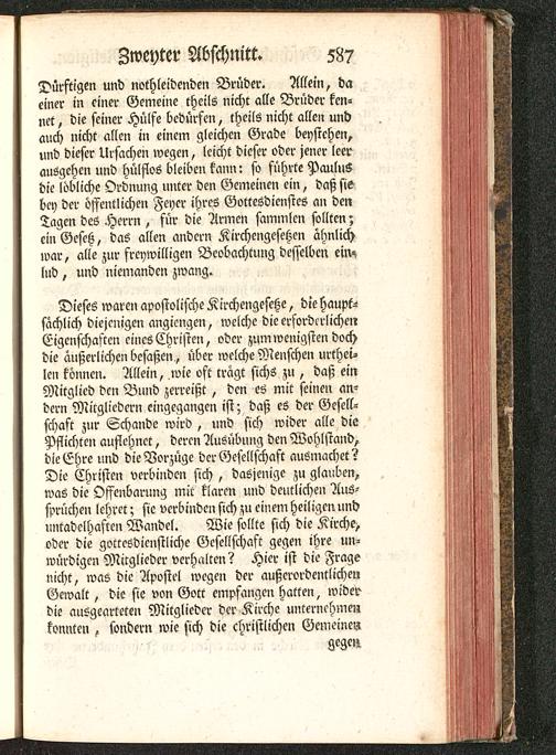 Dürftigen und nothleidenden Brüder. Allein, daeiner in einer Gemeine theils nicht alle Brüder ken-net , die seiner Hülfe bedürfen, theils nicht allen undauch nicht allen in einem gleichen Grade beysieh en,und dieser Ursachen wegen, leicht dieser oder jener leerausgehen und hülfios bleiben kann: so führte Paulus die löbliche Ordnung unter den Gemeinen ein, daß siebey der öffentlichen Feycr ihres Gottesdienstes an denTagen des Herrn , für die Armen sammlen sollten;ein Gesetz, das allen andern Kirchengesetzen ähnlichwar, alle zur frcywilligen Beobachtung desselben eimlud, und niemanden zwang.