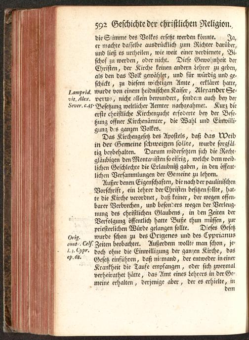 die S'imme des Volkes ersetzt werden könnte. Ja,er machte dasselbe ausdrücklich zum Richter darüber,und ließ es urtheilen, wie weit einer verdienete, Bi-schof zu werden, oder nicht. Diese Gewohnheit derChristen, der Kirche keinen andern Lehrer zugeben,als den das Volk gewählet, und für würdig und ge-schickt , zu diesem wichtigen Amte, erklaret hatte,wurde von einem heidnischen Kaiser, Alexander Se-^,'5.^/^. verlN', nicht allein bewundert, sondc- n auch beyderö'eve?'. 5.45- Besetzung weltlicher Aemter nachgeahmet. Kurz dieerste christliche Kirchenzucht erfoderte bey der Bese-tzung offner Kirchenamter, die Wahl und Einwilli-gung dl 6 ganzen Volkes.