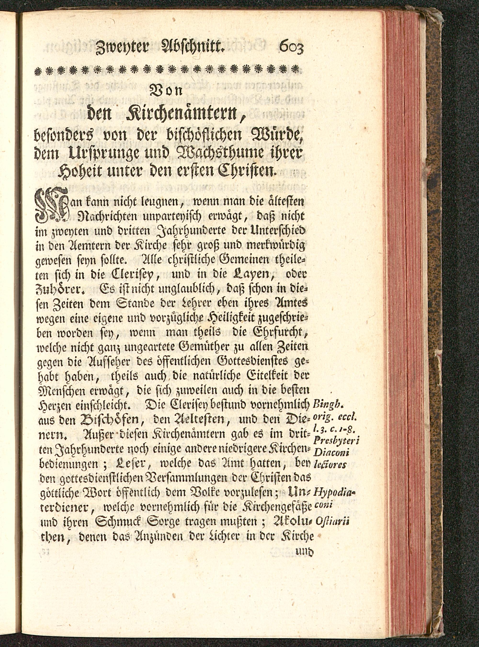 ^^"Kan kann nicht leugnen, wenn man die ältestenNachrichten unparteyisch erwägt, daß nichtim zweyten und dritten Jahrhunderte der Unterschiedin den Aemtern der Kirche sehr groß und merkwürdiggewesen seyn sollte. Alle christliche Gemeinen theil-ten sich in die Clerisey, und in die Layen, oderZuhörer. Es ist nicht unglaublich, daß schon in die-sen Zeiten dem Stande der Lehrer eben ihres Amteswegen eine eigene und vorzügliche Heiligkeit zugeschrie-ben worden sey, wenn man theils die Ehrfurcht,welche nicht ganz ungeartete Gemüther zu allen Zeitengegen die Aufseher des öffentlichen Gottesdienstes ge-habt haben, theils auch die natürliche Eitelkeit derMenschen erwägt, die sich zuweilen auch in die bestenHerzen einschleicht. Die Clerisey bestund vornehmlichaus den Bischöfen, den Aelresten, und den Die- <"Ä- ^c/.nern. Außer diesen Kirchenämtern gab es im drit-^^'^-ten Jahrhunderte noch einige andere niedrigere Kirchen-bcdienungen; Leser, welche das Amt hatten, bep/cFvnden gottcsdienstlichen Versammlungen der Christen dasgöttliche Wort öffentlich dem Volke vorzulesen; Un-/H-/>^/<i.rerdicner, welche vornehmlich für die Kirchcngefäßc c«-"und ihren Schmuck Sorge tragen mußten ; Akolu, o////,?/,'rhen, denen das Anzünden der lichter in der Kirche