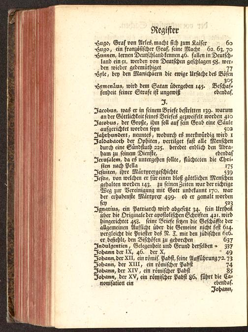Jacobus, was er in seinem Briefe besiritten 139- waruman der Göttlichkeit seines Briefes gezweifelt worden 410Jacobus, der Große, ihm soll auf sein Grab eine Säuleaufgerichtet worden sepn 502Jahrhundert, neuntes, wodurch es merkwürdig wird 1Jalvabaoch der Ophiten, vertilget fast alle Menschendurch eine Sündfluch 225. beredet endlich den Abra-ham zu seinem Dienste, ebendafJerusalem, da es untergehen sollte, flüchteten die Chri-sten nach Pella 175Jesuiten , ihre Martyrergcschichte 559Jesus, von welchen er für einen bloß göttlichen Menschengehalten worden 14z. zu seinen Zeiten war der richtigeWeg zur Vereinigung mit Gott unbekannt 170. warder erhabenste Martyrex 499. ob er gemalt wordensey 52zIgnatius, ein Patriarch wird abgesetzt Z4. sein Urtheilüber die Originale der apostolischen Schriften 421. wirdhingerichtet 458. seine Briefe setzen die Geschaffte derallgemeinen Aufsicht über die Gemeine nicht fest 614.vergleicht die Priester des N, Z. mit den jüdischen 616.«r befiehlt, den Bischöfen zu gehorchen 6z?Indulgenrien, Gelegenheit und Grund derselben » zz?Johann der IX, 46. der X, ^ 49