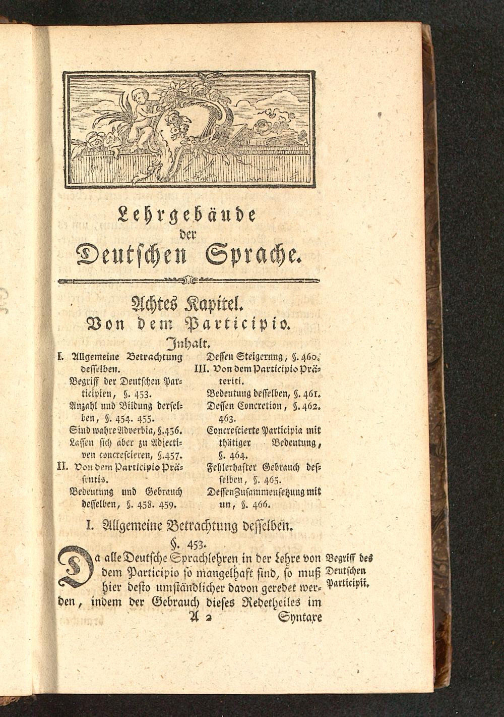Begriff der Deutschen Par-ticipien, 45z.Anzahl und Bildung dersel-ben, §. 454. 455-Sind wahreÄdverbia, Z.4Z6.Lassen sich aber zn Adjecti-ven concrescieren, Z>45?.II. Voüdempqrrieipioprä-ftnris.