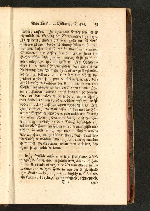 nieder, außer. In eher und ferner scheinst eseigentlich die Endung des Comparatives zu seyn.In gestern, ehedem gelleren, gelieroi,^ Nieders.gisteren scheinen beyde Ableitungssylben verbundenz» seyn, daher das Wort in manchen gemeinenMundarten nur gester lautet; welche Form imHochdeutschen fehlerhaft feyn würde, ob sie gleich ansich analogischer ist, als gestern. Im Oberdeut-schen ist eö noch sehr gewöhnlich, vermitteist dieserAbleitungssylbe Beschassenheitswörter zu Umstands-wörtern zu bilden, wenn eine Art und Weise be-zeichnet werden soll, zum deutlichen Beweise, daßder Unterschied zwischen den Umstandswörtern undBeschaffenheitswörtern von der Nation zu allen Zei-ten empfunden worden: er ist kranker forrgerei-sec, er hat mich unbekleideter angetroffen,wir haben ?s ihm rviederhohlrer gesagt, er ijtrodrer nach Hause getragen worden u.f.f. ImHochdeutschen, wo man dafür in den meisten Fäl-len die Beschassenheitswörter gebraucht, und sie auchmit allem Rechte gebrauchen kann, weil die Be-stimmung wirklich an dem Dinge befindlich ist,würde diese Form ein Fehler seyn, so analogisch undrichtig sie auch an sich seyn mag. Unsere neuernSprachlehrer, welche nicht wußten, was sie aus die-ser Endsylbe machen sollten, haben allerley darübergeträumet, welches man, wenn man tust hat, bei)ihnen selbst nachlesen kann.
