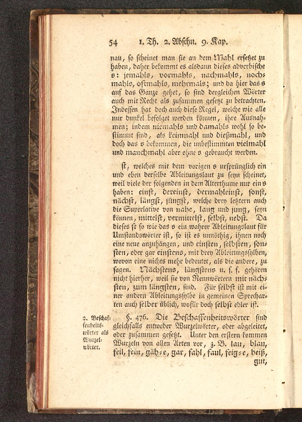 ?. Beschaf- §. 476. Die Deschaffenheitswörter sindftulie-tv- gleichfalls entweder Wurzclwörter, oder abgeleitet,nm-tt-r als oder zusammen gesetzt. Unter den.erstem kommen^Al' Wurzeln von allen Arten vor, z. B. lau, blau,ftii, fein, gäh-e, gar, fahl, faul, feig-e, heP,