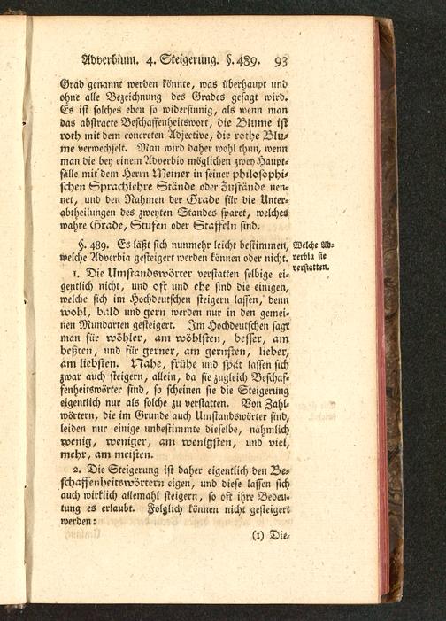 Grad genannt werden könnte, was überhaupt undohne alle Bezeichnung des Grades gesagt wird.Es ist solches eben so widersinnig, als wenn mandas abstractc Beschaffenhciiswort, die Blume istroch mit dem conereteu Adjective, die reche Vlu-me verwechselt. Man wird daher wohl thun, wennman die bey einem Adverbio möglichen zwey Haupt-stille mit'dem Herrn Meiner in seiner philosophi-schen Sprachlehre Gründe oder Zustünde nen-net, und den Nahmen der Grade für die Unter-abtheilungen des zweyten Standes sparet, welcheswahre Grade, Stufen oder Staffeln sind.