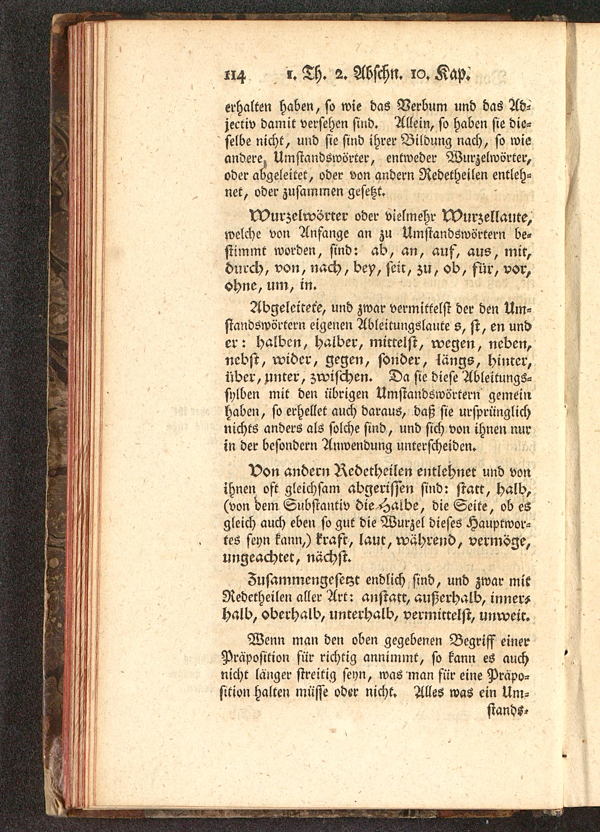 lVurzelwörter oder vielmehr N^urzellame,welche von Anfange an zu Umstandswörtern be-stimmt worden, sind: ab, an, auf, aus, mir,durch, von, nach, bey, seit, zu, ob, für, vor,ohne, um, in.