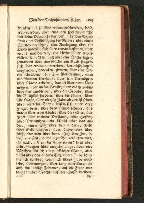 tränken u. s. f. über etwas erschrecken, böse,froh werden, über jemanden sporren, machemir keine Vorwürfe darüber. (8) Den Gegen-stand einer Beschäftigung des Geistes: über einenSpruch predigen, eine Auslegung über einBuch machen, sich über etwas besinnen, überetwas nachdenken, ein Urtheil über etwasfällen, seine Meinung über eine Sache sagen,jemanden über eine Sache um Rath fragen,sich über etwas unterreden, berathschlagen,vergleichen, bedenken, streiten, über eine Sa-che" schreiben. (9) Eine Überschreitung, einenunbestimmten Überschuß: über sein Vermögen,über Macht arbeiten, das ist über mein Ver-mögen, über meine Aräsir-, über die gewöhn-liche Zeit ausbleiben, über die Gebühr, üb«.-die Willigkeit fordern, über die Maße, überalle Maße, über vierzig Jahr alt, es ist schonüber vierzehn Tage, daß», s. f. über dreyFinger breit, über drey Pfund schwer, dasmacht über zehn Thaler, über die Hälfte, dasgehet über meinen Verstand, über Hoffen,über Vermuthen, ein Mahl über das an-dere, einen Tag über den andern, Geldüber Geld biethen, über dieses oder überdieß, aber nicht über dem. (io) Eine Zeit, so-wohl eine Zeit, welche inzwischen verfließen wird,für nach, und auf die Frage wenn:' heut überacht, morgen über vierzehn Tage, über vierlVochen bin ich ein glücklicher Mann, alle-mahl über den andern Tag, übe^ s ^jahr kom-me ich wieder, wenn ich übers ^)ahr nochlebe, übermorgen, über lang oder kurz; alsauch eine völlige Zeitdauer, auf die Frage wielanges über Nacht auf die Gasse bleiben,