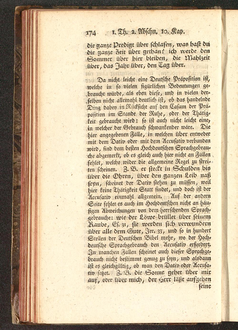 Da nicht leicht eine Deutsche Präposition ist,welche in so vielen figürlichen Bedeutungen ge-braucht würde, als eben diese, und in vielen der-selben nicht allemahl deutlich ist, ob das handelndeDing dabey in Rücksicht auf den Casum der Prä-position im Stande der Ruhe, oder der Thätig-keit gebraucht wird: so ist auch nicht leicht eine,in welcher der Gebrauch schwankender wäre. Diehier angegebenen Fälle, in welchen über entwedermit dem Dativ oder mit dem Accusativ verbundenwird, Und dem besten Hochdeutschen Sprachgebrau-che abgemerkt, ob e6 gleich auch hier nicht an Fällenfehlet, welche wider die allgemeine Regel zu strei-ten scheinen. Z. B. er sie.Fc in Schulden bisüber die Dhren, über den ganzen L.eib naßseyn, scheinet der Dativ stehen zu müssen, weilhier keine Thätigkeit Statt findet, und doch ist derAccusativ einmahl allgemein. Auf der andernSeite fehlet eö auch im Hochdeutschen nicht an häu-figen Abweichungen von dein herrschenden Sprach-gebrauche: rvie der Löwe brüllet über seinemRaube, Es. zi, sie werden sich verwundernüber alle dem Gute, Ier. zz, und so in hundertStellen der Deutschen Bibel mehr, wo der Hoch-deutsche Sprachgebrauch den Accusativ erfordert.In manchen Fallen scheinet auch dieser Sprachge-brauch nicht bestimmt genug zu seyn, und alsdannist es gleichgültig, ob man den Dativ oder Accusa-tiv setzet. Z. B. die Sonne gehet über mirauf, oder über mich, der Herr läßt aufgehen