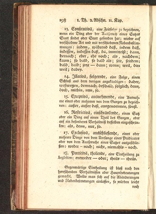 16. Restrictivci, einschränkende, einen Satzoder ein Ding auf einen Theil des Ganzen, oderauf ein besonderes Verhältniß desselben einzuschrän-ken: als, denn, nur, so.