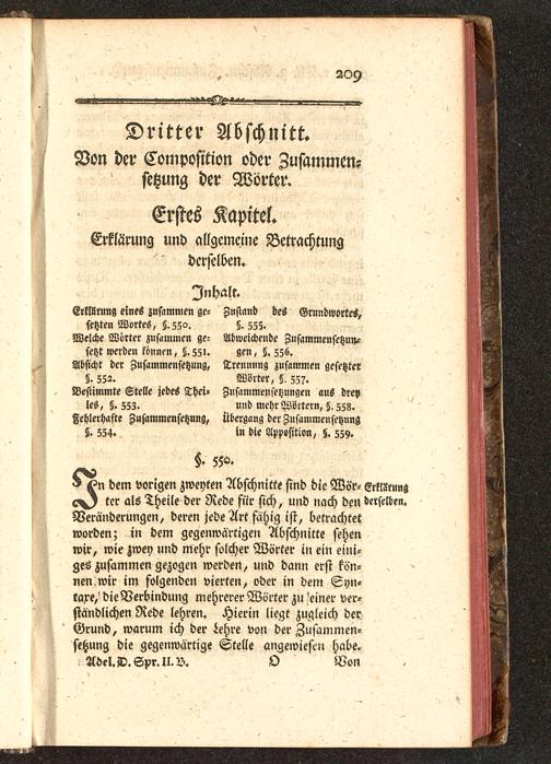 dem vorigen zweyten Abschnitte sind die Wör- CrMrnngc^) ter als Theile der Rede für sich, und nach den derselben.Veränderungen, deren jede Art fähig ist, betrachtetworden; in dem gegenwärtigen Abschnitte sehenwir, wie zwey und mehr solcher Wörter in ein eini-ges zusammen gezogen werden, und dann erst kön-nen wir im folgenden vierten, oder in dem Syn-laxe,'die Verbindung mehrerer Wörter zu seiner ver-ständlichen Rede lehren. Hierin liegt zugleich derGrund, warum ich der iehre von der Zusammen-setzung die gegenwärtige Stelle angewiesen habe.Adel. D.Spr. U.V. O Von
