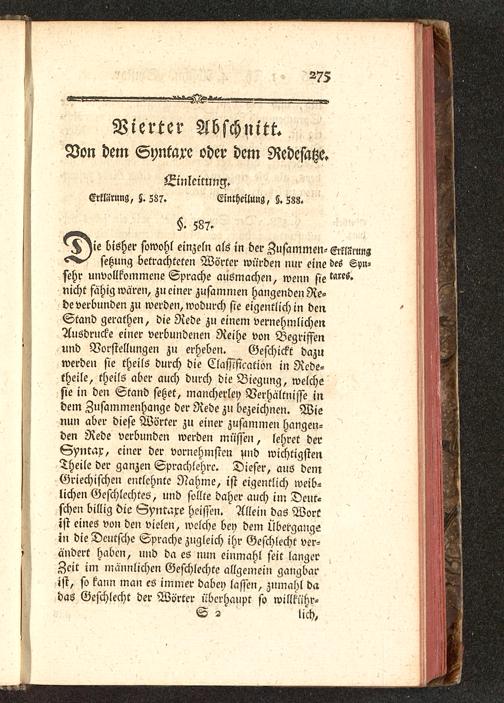 ie bisher sowohl einzeln als in der Zusammen- Erklärungsetzung betrachteten Wörter würden nur eine des Syn-sehr unvollkommene Sprache ausmachen, wenn sie ^es.nicht fähig waren, zu einer zusammen Hangenden Re-de verbunden zu werden, wodurch sie eigentlich in den.Stand gerathen, die Rede zu einem vernehmlichenAusdrucke einer verbundenen Reihe von Begriffennnd Vorstellungen zu erheben. Geschickt dazuwerden sie theils durch die ClaW'eation in Rcde-theile, theils aber auch durch die Biegung, welchesie in den Stand setzet, mancherley Verhältnisse indem Zusammenhange der Rede zu bezeichnen. Wienun aber diese Wörter zu einer zusammen Hangen-den Rede verbunden werden müssen, lehret derSyntax, einer der vornehmsten und wichtigstenTheile der ganzen Sprachlehre. Dieser, aus demGriechischen entlehnte Nahme, ist eigentlich weib-lichen Geschlechtes, und sollte daher auch im Deut-schen billig die Gyntaxe hsissen. Mein das Wortist eines von den vielen, welche bey dem Übergängein die Deutsche Sprache Zugleich ihr Geschlecht ver-ändert haben, und da es nun einmahl seit langerZeit im mannlichen Geschlechte allgemein gangbarist, so kann man es immer dabey lassen, zumahl dadas Geschlecht der Wörter überhaupt so willkühr«