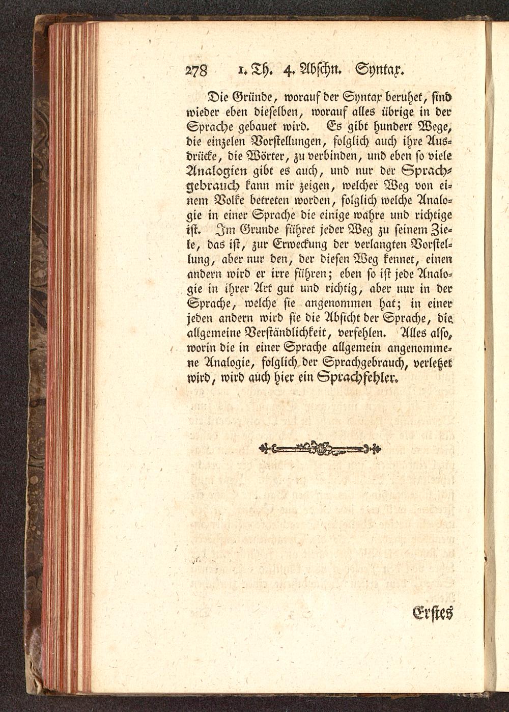 Die Gründe, worauf der Syntax beruhet, sindwieder eben dieselben, worauf alles übrige in derSprache gebauet wird. Es gibt hundert Wege,die einzelen Vorstellungen, folglich auch ihre Aus-drücke, die Wörter, zu verbinden, und eben so vieleAnalogien gibt es auch, und nur der Sprach-gebrauch kann mir zeigen, welcher Weg von ei-nem Volke betreten worden, folglich welche Analo-gie in einer Sprache die einige wahre und richtigeist. Im Grunde führet jeder Weg zu feinem Zie-le, das ist, zur Erweckung der verlangten Vorstel-lung, aber nur den, der diesen Weg kennet, einenandern wird er irre führen; eben so ist jede Analo-gie in ihrer Art gut und richtig, aber nur in derSprache, welche sie angenommen hat; in einerjeden andern wird sie die Absicht der Sprache, die.allgemeine Verständlichkeit, verfehlen. Alles also,worin die in einer Sprache allgemein angenomme-ne Analogie, folglich der Sprachgebrauch, verletzetwird, wird auch hier ein Sprachfehler»