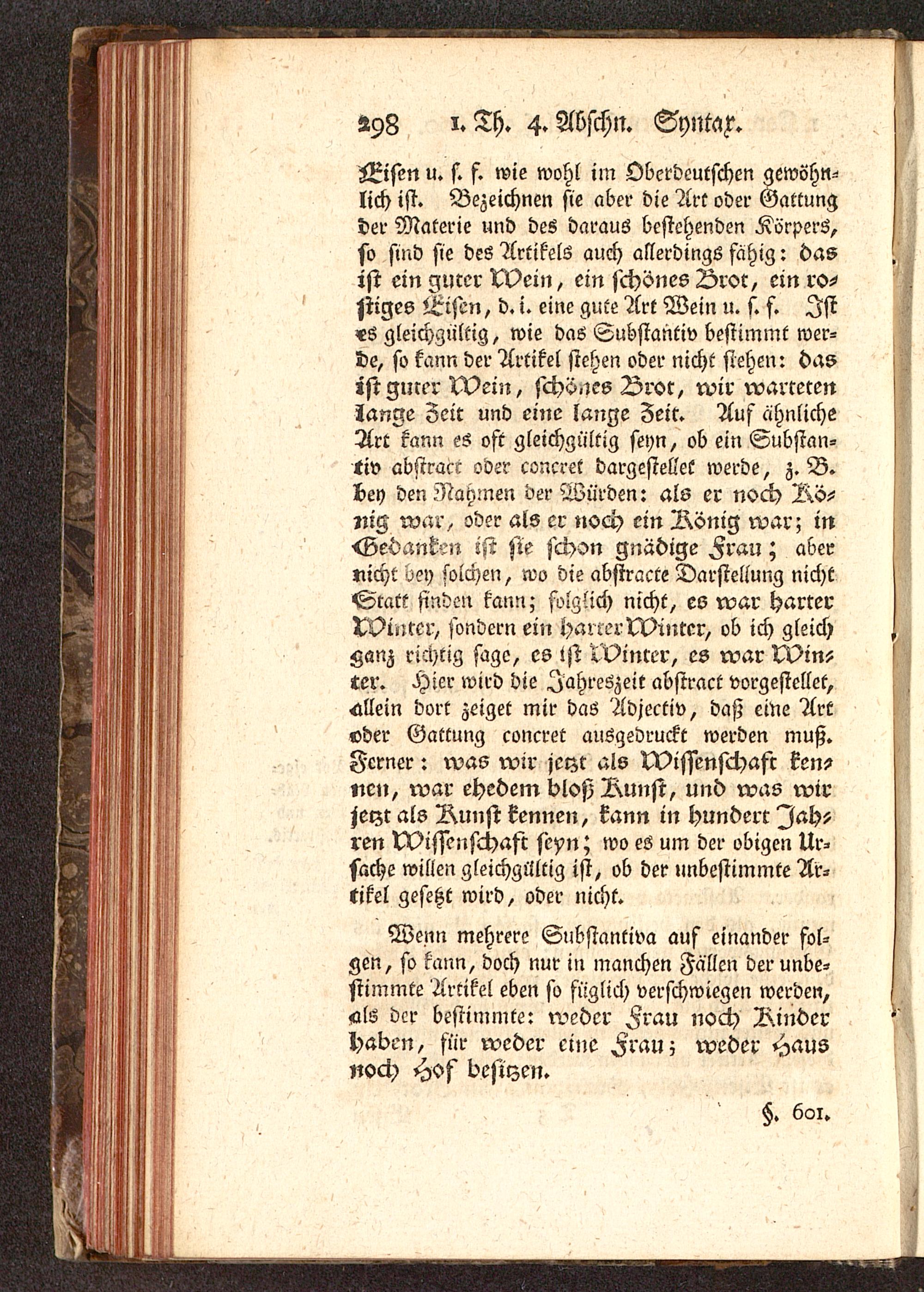 Luisen u. f. f. wie wohl im Oberdeutschen gewöhn-lich ist. Bezeichnen sie aber die Art oder Gattungder Materie und des daraus bestehenden Körpers,so sind sie des Artikels auch allerdings fähig: dasist ein gmer TVein, ein schönes L>roc, ein ro-siges Eisen, d.i. eine gute Art Wein u. s. f. Ist-es gleichgültig, wie das Substantiv bestimmt wer-de, so kann der Artikel stehen oder nicht stehen: dasist guter N?ein, schö.ies Bror, wir wartetenZange Zeit und eine lange Zeit. Auf ähnlicheArt rann es oft gleichgültig seyn, ob ein Substan-tiv abstracr oder concret dargestellet werde, z.B.bey den Nahmen der Würden: als er noch Rö-ntg war, oder als er noch ein Aönig war; inGedanken ist sie schon gnädige Frau; aber»licht bey solchen, wo die abstracte Darstellung nichtStatt finden kann; folglich nicht, es war harterZVimer, sondern ein harrerWintcr, ob ich gleichK«nz richtig sage, es ist Minrer, es war Min-ter. Hier wird die Jahreszeit absiract vorgestellet,allein dort zeiget mir das Adjectiv, daß eine Artoder Gattung concret ausgedruckt werden muß.Ferner: was wir jerzt als Wissenschaft den?nen, war ehedem bloß Nunst, und was wirjetzt als Aunst kennen, kann in hundert Jah-ren Wissenschaft seyn; wo es um der obigen Ur-sache willen gleichgültig ist, ob der unbestimmte Ar-tikel gesetzt wird, oder nicht.