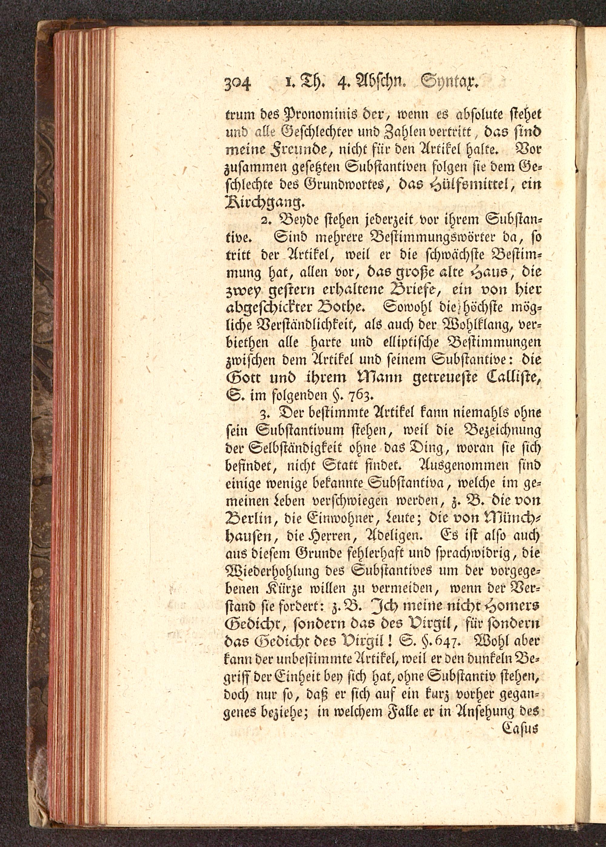2. Beyde stehen jederzeit vor ihrem Substan-tive. Sind mehrere Bestimmungswörter da, sotritt der Artikel, weil er die schwächste Bestim-mung hat, allen vor, das große alce Haus, diezwey gestern erhaltene Ariese, ein von hierabgeschickter Vothe. Sowohl die-höchste mög-liche Verständlichkeit, als auch der Wohlklang, ver-biethen alle harte und elliptische Bestimmungenzwischen dem Artikel und seinem Substantive: dieGorc und ihrem Mann getreueste Calliste,S. im folgenden §. 76z.
