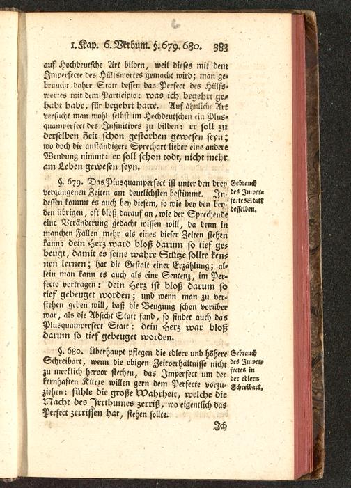 §. 679. Das Plusquamperfekt ist unter den drey Gebrauchverqcmgenen Zeiten am deutlichsten bestimmt. In- ^ 2mver«dessen kommt es auch bey diesem, so wie bey den bey ^^.^^den übrigen, oft bloß darauf an, wie der Sprechende ^ 'eine Veränderung gedacht wissen will, da denn inmanchen Fällen mchr als eines dieser Zeiten stehenkann: dein Her; ward bloß darum so tief ge-beugt, damit es seine wahre Stürze sollte ken-nen lernen; hat die Gestalt einer Erzählung; al-lein man kann es auch als eine Sentenz, im Per-fccto vortragen: dein Herz ist bloß darum sotief gcbeuget worden; und wenn man zu ver-stehen geben will, daß die Beugung schon vorüberwar, als die Absicht Statt fand, so findet auch daöPlusquampersect Statt: dein Herz war bloßdarum so tief gebeuger worden.
