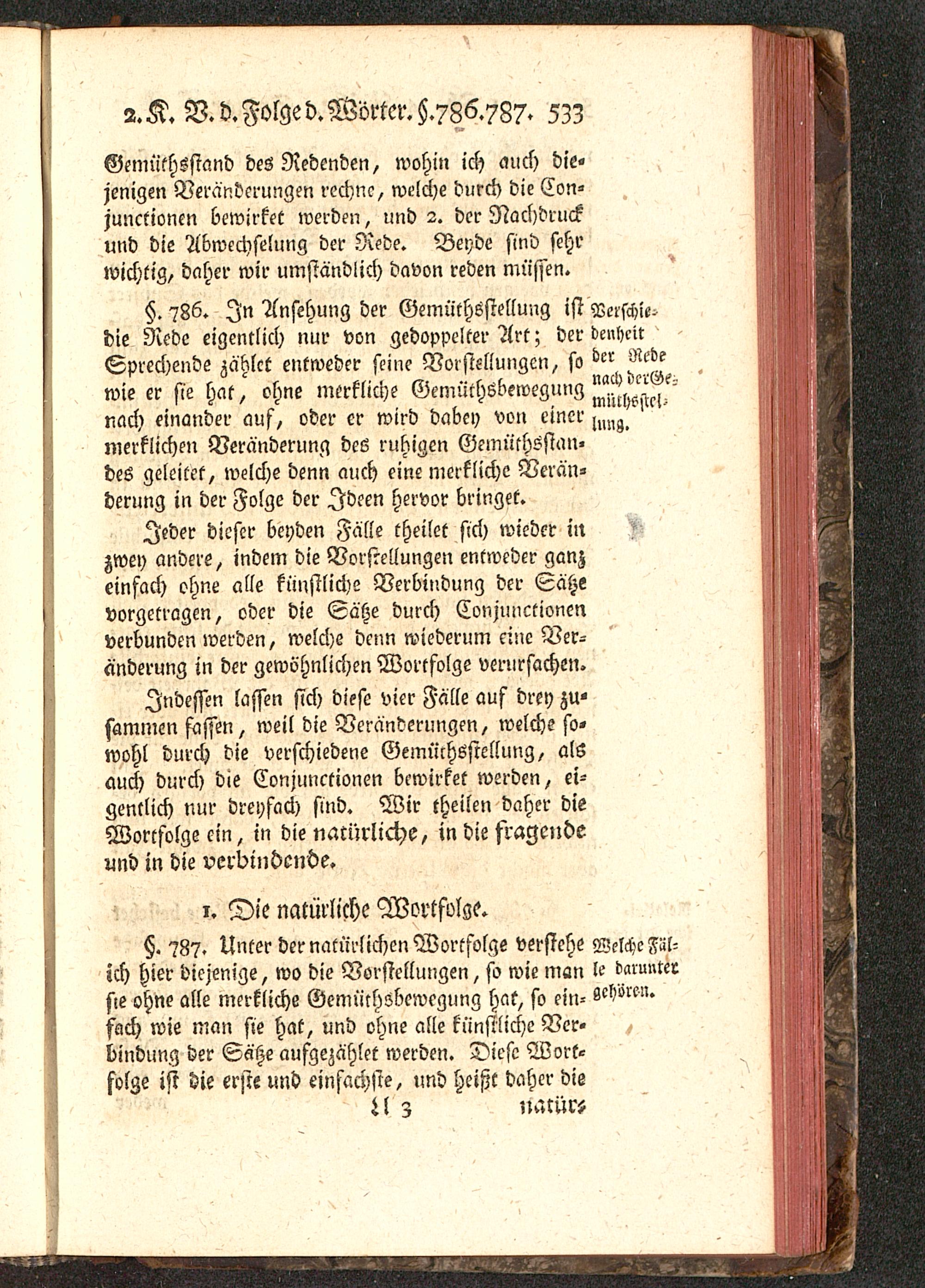 §. 787. Unter der natürlichen Wortfolge verstehe Welche xiil-Zch hier diejenige, wo die Vorstellungen, so wie man le daruntersie ohne alle merkliche Gemüthsbewegung hat, so ein- schören,fach wie man sie hat, und ohne alle künstliche Ver-bindung der Sähe aufgezählet werden. Diese Wort-folge ist die erste und einfachste, und heißt daher die