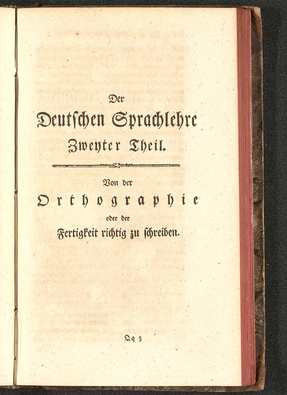 DerDeutschen SprachlehreZweyter Theil..,>— —^ -sN x-, ' --^' ."" >->.Von derOrthographieoder derFertigkeit richtig zu schreiben.Qq Z