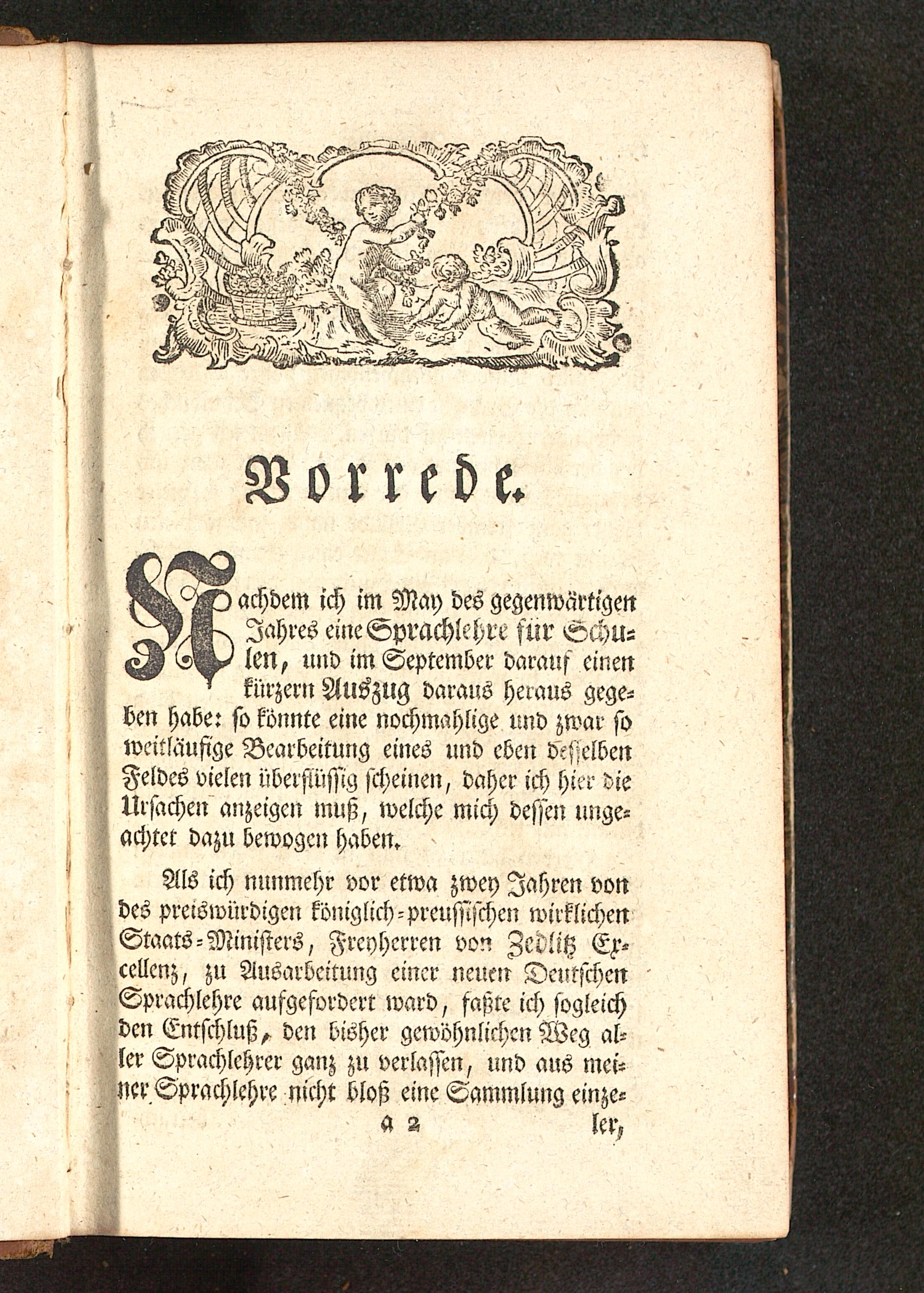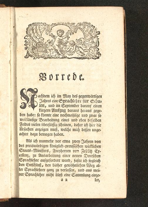 Als ich nunmehr vor etwa zwey Iahren vondes preiswürdigen kömglich-preussischen wirklichenStaats-Ministers, Freyherren von Zedlitz Ex-cellenz, zu Ausarbeitung einer neuen DeutschenSprachlehre aufgefordert ward, faßte ich sogleichden Entschluß, den bisher gewöhnlichen Weg al-ler Sprachlehrer ganz zu verlassen, und aus mei-ner Sprachlehre nicht bloß eine Sammlung einze-