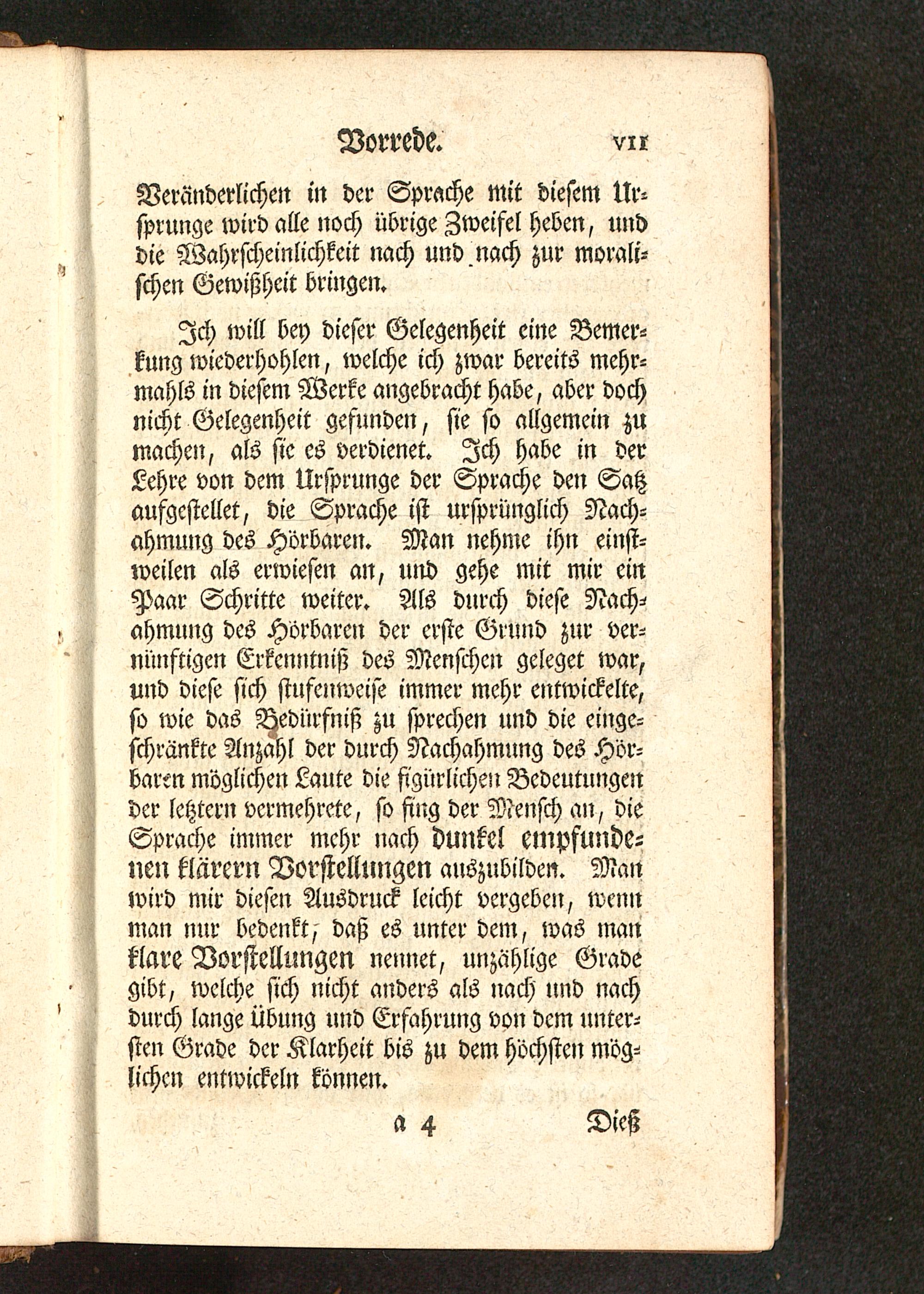 Ich will bey dieser Gelegenheit eine Bemer-kung wiederhohlen, welche ich zwar bereits mehr-mahls in diesem Werke angebracht habe, aber dochnicht Gelegenheit gesunden, sie so allgemein zumachen, als sie es verdienet. Ich habe in derLehre von dem Ursprünge der Sprache den Satzaufgestellet, die Sprache ist ursprünglich Nach-ahmung des Hörbaren. Man nehme ihn einst-weilen als erwiesen an, mw gehe mit mir einPaar Schritte weiter. Als durch diese Nach-ahmung des Hörbaren der erste Grund zur ver-nünftigen Erkenntniß des Menfchcn geleget war,und diefe sich stufenweise immer mehr entwickelte,so wie das Bedürfniß zu sprechen und die einge-schränkte Anzahl der durch Nachahmung des Hör-baren möglichen Laute die figürlichen Bedeutungender letztem vermehrte, fo fing der Mensch an, dieSprache immer mehr nach dunkel empfunde-nen klärern Vorstellungen auszubilden. Manwird mir diesen Ausdruck leicht vergebeil, wennman nur bedenkt, daß es unter dem, was manklare Vorstellungen nennet, unzählige Gradegibt, welche sich nicht anders als nach und nachdurch lange übuug und Erfahrung von dem unter-sten Grade der Klarheit bis zu dem höchsten mög-lichen entwickeln können.
